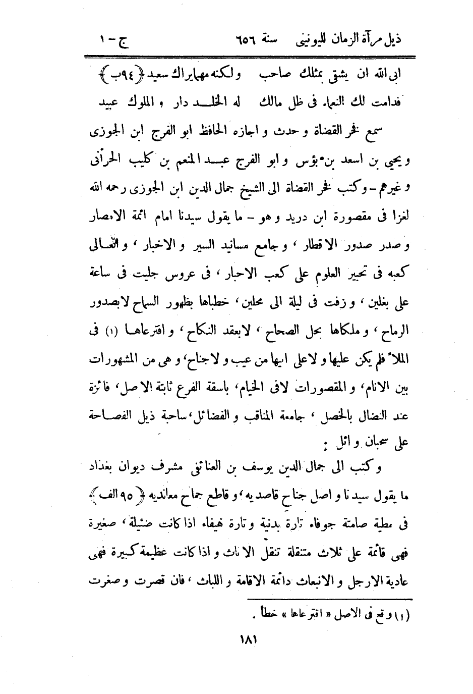 وكتب إلى جمال الدين يوسف بن العنائفي مشرف ديوان بغداد ما يقول سيدنا واصل جناح قاصديه وقاطع جماح معانديه في مطية صامتة جوفاء تارة بدينة وتارة هيفاء إذا كانت ضئيلة صغيرة فهي قائمة على ثلاث متنقلة تنقل الأثاث وإذا كانت عظيمة كبيرة فهي عادية الأرجل والإنبعاث دائمة الإقامة واللباث فإن قصرت وصغرت