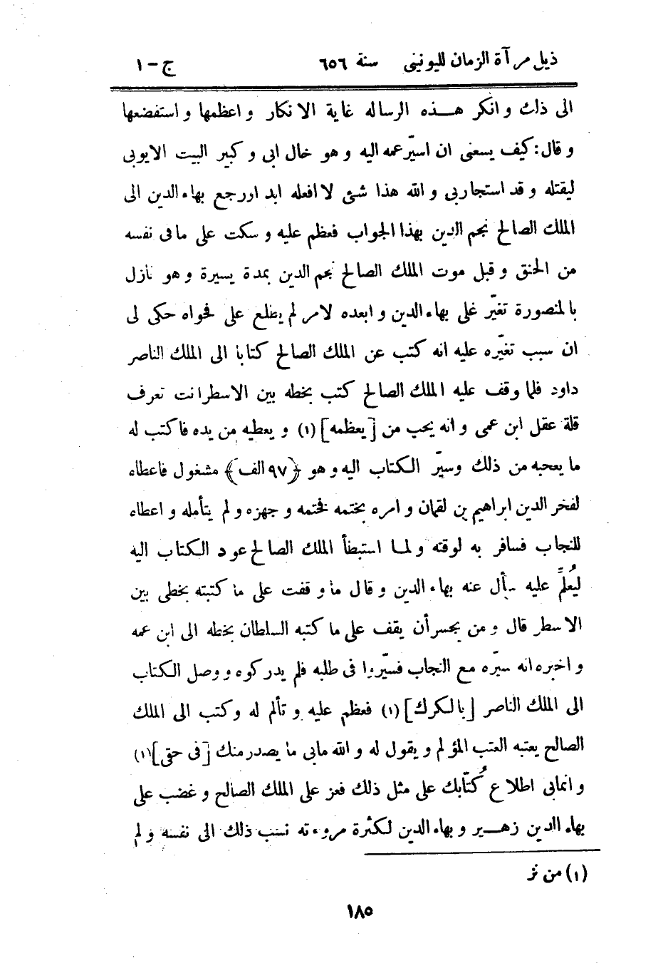 إلى ذلك وأنكر هذه الرسالة غاية الإنكار وأعظمها واستفضعها وقال كيف يسعني أن أسير عمه إليه وهو خال أبي وكبير البيت الأيوبي ليقتله وقد استجار بي والله هذا شيء لا أفعله أبداً ورجع بهاء الدين إلى الملك الصالح نجم الدين بهذا الجواب فعظم عليه وسكت على ما في نفسه من الحنق وقبل موت الملك الصالح نجم الدين بمدة يسيرة وهو نازل بالمنصورة تغير على بهاء الدين وأبعده لأمر لم يطلع على فحواه حكى لي أنه سبب تغيره عليه أنه كتب عن الملك الصالح كتابا إلى الملك الناصر داود فلما وقف عليه الملك الصالح كتب بخطه بين الأسطر أنت تعرف قلة عقل ابن عمي وهو يحب من يعظمه ويعطيه من يده فاكتب له ما يعجبه من ذلك وسير الكتاب إليه وهو مشغول فأعطاه لفخر الدين إبراهيم بن لقمان وأمر بختمه فخيمه وجهزه ولم يتأمله وأعطاه للنجاب فسافر به لوقته ولما استبطأ الملك الصالح عود الكتاب إليه ليلم عليه سأل عنه بهاء الدين وقال ما وقفت على ما كتبت بخطي بين الأسطر قال ومن يجسر أن يقف على ما كتبه السلطان بخط يده إلى ابن عمه وأخبره أنه سيره مع النجاب فسيروا في طلبه فلم يدركوه ووصل الكتاب إلى الملك الناصر بالكرك فعظم عليه وتألم له وكتب إلى الملك الصالح يعتبه العتب المؤلم ويقول له والله ما بي ما يصدر منك في حقي وإنما بي أطلاع كتابك على مثل ذلك فعز على الملك الصالح وغضب على بهاء الدين زهير وبهاء الدين لكثرة مرؤته نسب ذلك إلى نفسه ولم