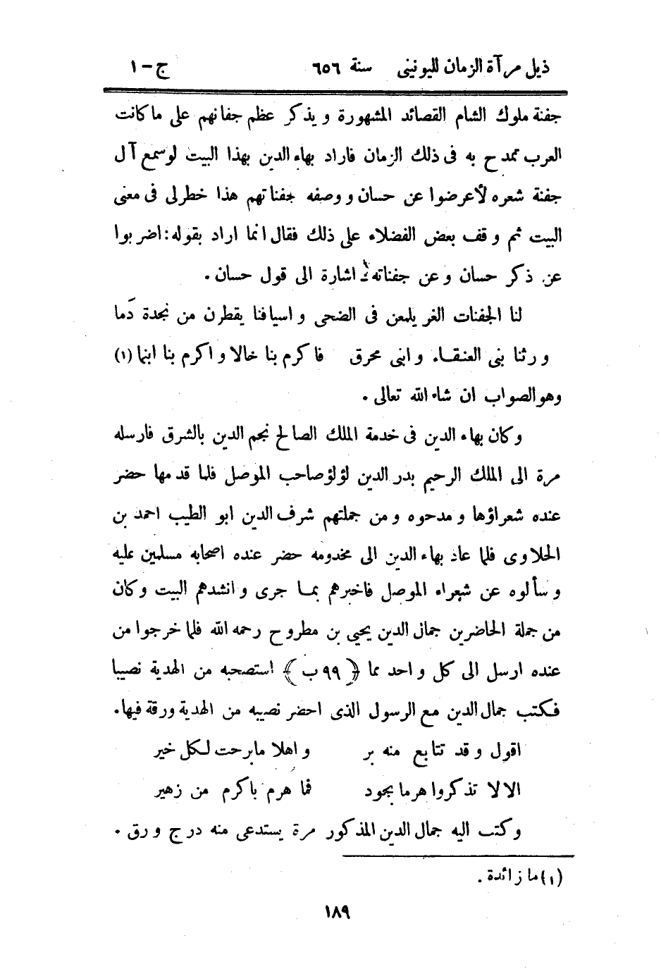 جفنة ملوك الشام القصائد المشهورة ويذكر عظم جفانهم على ما كانت العرب تمدح به في ذلك الزمان فأراد بهاء الدين بهذا البيت لو سمع آل جفنة شعره لأعرضوا عن حسان ووصفه جنفاتهم هذا خطر لي في معنى البيت ثم وثق بعض الفضلاء على ذلك فقال إنما أراد بقوله اضربوا عن ذكر حسان وعن جفناته إشارة إلى قول حسان: