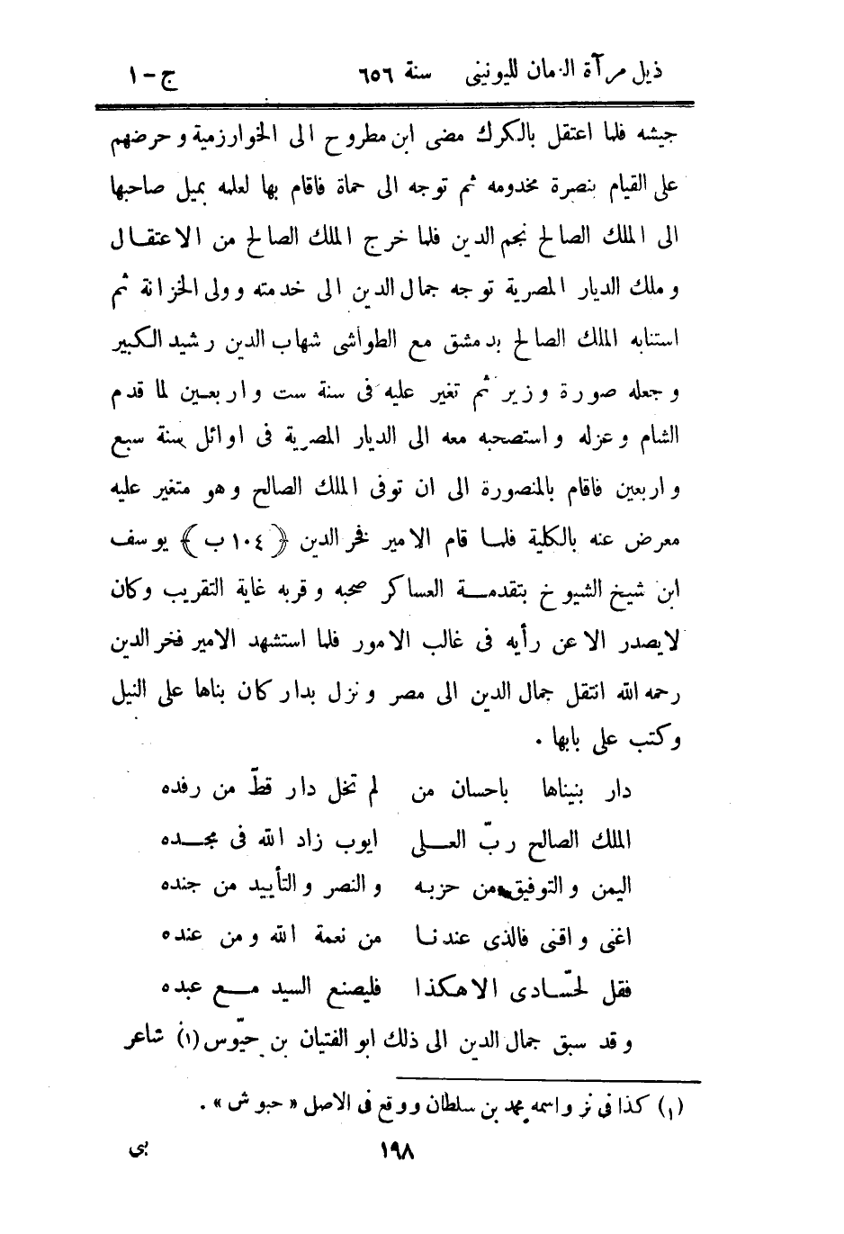 جيشه فلما أعتقل بالكرك مضى أبن مطروح إلى الخوارزمية وحرضهم على القيام بنصرة مخدومه ثم توجه إلى حماة وأقام بها لعلمه بميل صاحبها إلى الملك الصالح نجم الدين فلما خرج الملك الصالح من الاعتقال وملك الديار المصرية توجهه جمال الدين إلى خدمته وولي الخزانة ثم استنابه الملك الصالح بدمشق مع الطواشي شهاب الدين رشيد الكبير وجعله صورة وزير ثم تغير عليه في سنة ست وأربعين لما قدم الشام وعزله واستصحبه معه إلى الديار المصرية في أوائل سنة سبع وأربعين فأقام بالمنصورة إلى أن توفي الملك الصالح وهو متغير عليه معرض عنه بالكلية فلما قام الأمير فخر الدين يوسف بن شيخ الشيوخ بتقدمة العساكر صحبه وقربه غاية التقريب وكان لا يصدر إلا عن رأيه في غالب الأمور فلما استشهد الأمير فخر الدين رحمه الله انتقل جمال الدين إلى مصر ونزل بدار كان بناها على النيل وكتب على بابها.