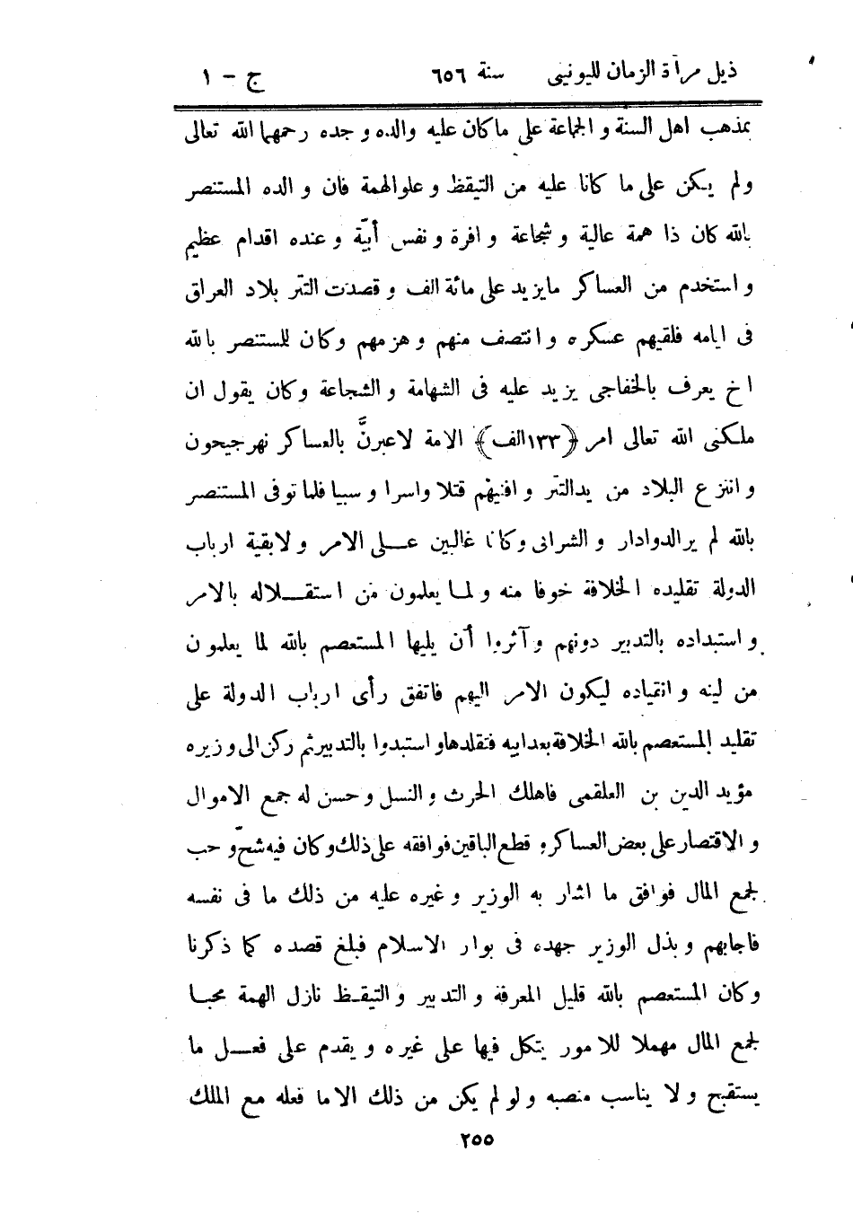 بمذهب أهل السنة والجماعة على ما كان عليه والده وجده رحمهما الله تعالى ولم يكن على ما كانا عليه من التيقظ وعلو الهمة فإن والده المستنصر بالله كان ذا همة عالية وشجاعة وافرة ونفس أبية وعنده إقدام عظيم واستخدم من العساكر ما يزيد على مائة ألف وقصدت التتر بلاد العراق في أيامه فلقيهم عسكره وانتصف منهم وهزمهم وكان للمستنصر بالله أخ يعرف بالخفاجي يزيد عليه في الشهامة والشجاعة وكان يقول إن ملكني الله تعالى أمر الأمة لاعبرن بالعساكر نهر جيحون وأنتزع البلاد من يد التتر وأفنيهم قتلاً واسراً وسبياً فلما توفى المستنصر بالله لم ير الدوادار والشرابي وكانا غالبين على الأمر ولا بقية أرباب الدولة تقليده الخلافة خوفاً منه ولما يعلمون منه أستقلاله بالأمر واستبداده بالتدبير دونهم وآثروا أن يليها المستعصم بالله لما يعلمون من لينه وأنقياده ليكون الأمر إليهم فاتفق رأي أرباب الدولة على تقليد المستعصم بالله الخلافة بعد أبيه فتقلدها وأستبدوا بالتدبير ثم ركن إلى وزيره مؤيد الدين العلقمي فأهلك الحرث والنسل وحسن له جمع الأموال والأقتصار على بعض العساكر وقطع الباقين فوافقه على ذلك وكان فيه شح وحب لجمع المال فوافق ما أشار به الوزير وغيره عليه من ذلك ما في نفسه فأجابهم وبذل الوزير جهده في بوار الإسلام فبلغ قصده كما ذكرنا وكان المستعصم بالله قليل التدبير والتيقظ نازل الهمة محباً لجمع المال مهملاً للأمور يتكل فيها على غيره ويقدم على فعل ما يستقبح ولا يناسب منصبه ولو لم يكن من ذلك إلا ما فعله مع الملك