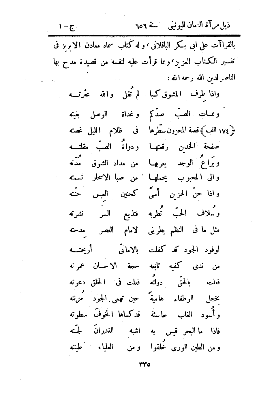 بالقراآت على أبي بكر الباقلاني وله كتاب سماه معادن الأبريز في تفسير الكتاب العزيز ومما قرأت عليه لنفسه من قصيدة مدح بها الناصر لدين الله رحمه الله: