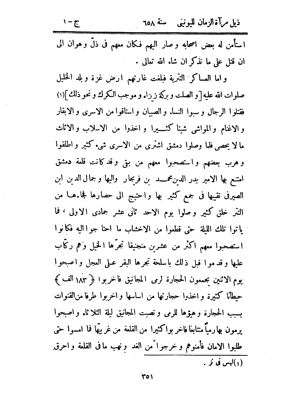 وأما العساكر التترية فبلغت غارتهم أرض غزة وبلد الخليل صلوات الله عليه والصلت وبركة زيزاء وموجب الكرك ونحو ذلك فقتلوا الرجال وسبوا النساء والصبيان واستاقوا من الأسرى والأبقار والأغنام والمواشي شيئاً كثيراًَ وأخذوا من الأسلاب والأثاث ما لا يحصى فلما وصلوا دمشق اشترى من الأسرى شئ كثير وأطلقوا وهرب بعضهم واستصحبوا معهم من بقي وقد كانت قلعة دمشق امتنع بها الأمير بدر الدين محمد بن فريجار واليها وجمال الدين بن الصيرفي نقيبها في جمع كثير بها واحتيج إلى حصارها فجاءها من التتر خلق كثير وصلوا يوم الأحد ثاني عشر جمادى الأولى فما يأتوا تلك الليلة حتى قطعوا من الأخشاب ما احتاجوا إليه فكانوا أستصحبوا معهم أكثر من عشرين منجنيقاً تجرها الخيل وهم ركاب عليها وقدموا قبل ذلك بأسلحة تجرها البقر على العجل وأصبحوا يوم الاثنين يجمعون الحجارة لرمي المجانيق فاخربوا حيطاناً كثيرةً وأخذوا حجارتها من أساسها وأخربوا طرفاً من القنوات بسبب الحجارة وهيؤها للرمي ونصبت المجانيق ليلة الثلاثاء وأصبحوا يرمون بها رمياً فأخربوا كثيراً من القلعة من غربيها فما أمسوا حتى طلبوا الأمان فأمنوهم وخرجوا من الغد ونهب ما في القلعة وأحرق