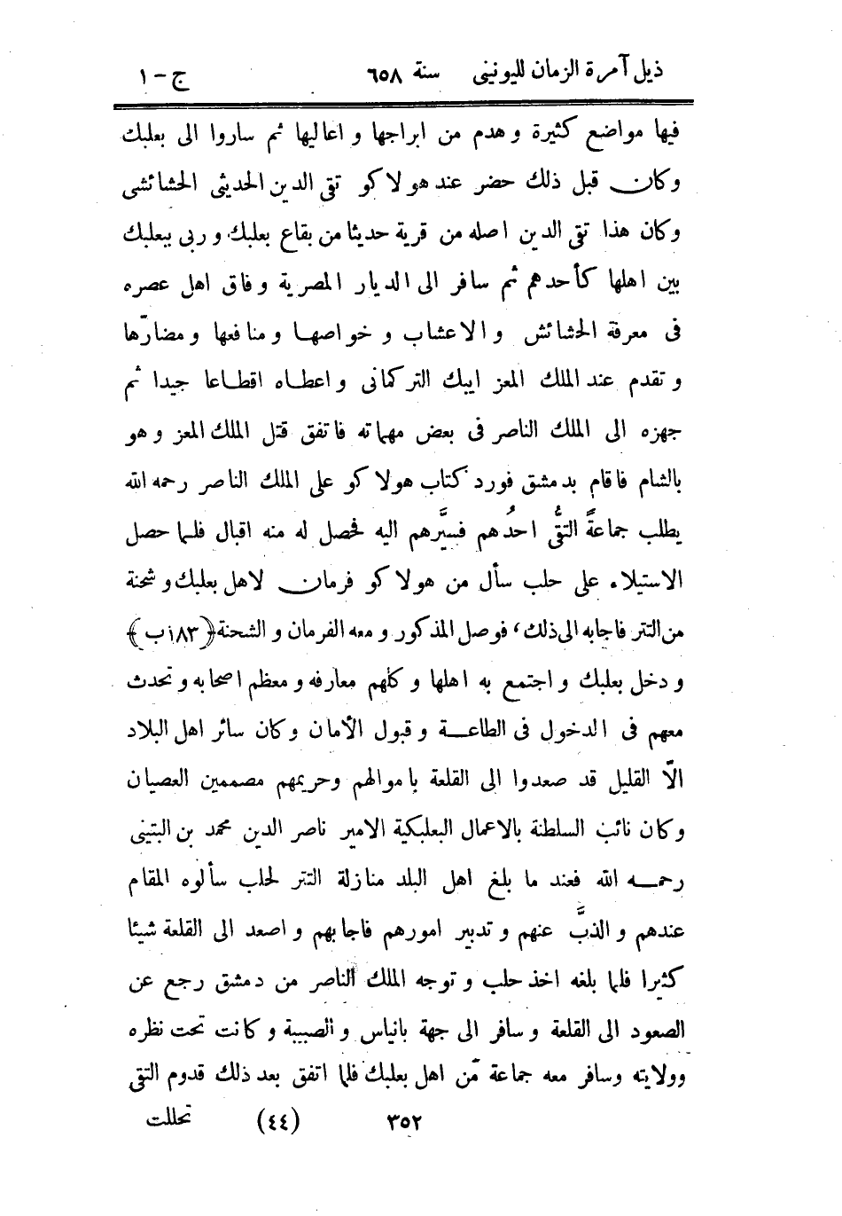 فيها مواضع كثيرة وهدم من أبراجها وأعاليها ثم ساروا إلى بعلبك وكان قبل ذلك حضر عند هولاكو تقي الدين الحديثي الحشائشي وكان هذا تقي الدين أصله من قرية حديثا من بقاع بعلبك وربي ببعلبك بين أهلها كأحدهم ثم سافر إلى الديار المصرية وفاق أهل عصره في معرفة الحشائش والأعشاب وخواصها ومنافعها ومضارها وتقدم عند الملك المعز أيبك التركماني وأعطاه أقطاعاً جيداً ثم جهزه إلى الملك الناصر في بعض مهماته فاتفق قتل الملك المعز وهو بالشام فأقام بدمشق فورد كتاب هولاكو على الملك الناصر رحمه الله يطلب جماعة التقى أحدهم فسيرهم إليه فحصل له منه إقبال فلما حصل الإستيلاء على حلب سأل من هولاكو فرمان لأهل بعلبك وشحنة من التتر فأجابه إلى ذلك فوصل المذكور ومعه الفرمان والشحنة ودخل بعلبك واجتمع به أهلها وكلهم معارفه ومعظم أصحابه وتحدث معهم في الدخول في الطاعة وقبول الأمان وكان سائر أهل البلاد إلا القليل قد صعدوا إلى القلعة بأموالهم وحريمهم مصممين على العصيان وكان نائب السلطنة بالأعمال البعلبكية الأمير ناصر الدين محمد بن البتيني رحمه الله فعندما بلغ أهل البلد منازلة التتر لحلب سألوه المقام عندهم والذب عنهم وتدبير أمورهم فأجابهم وأصعد إلى القلعة شيئاً كثيراً فلما بلغه أخذ حلب وتوجه إلى الملك الناصر من دمشق رجع عن الصعود إلى القلعة وسافر من جهة بانياس والصبيبة وكانت تحت نظره وولايته وسافر معه جماعة من أهل بعلبك فلما اتفق بعد ذلك قدوم التقى