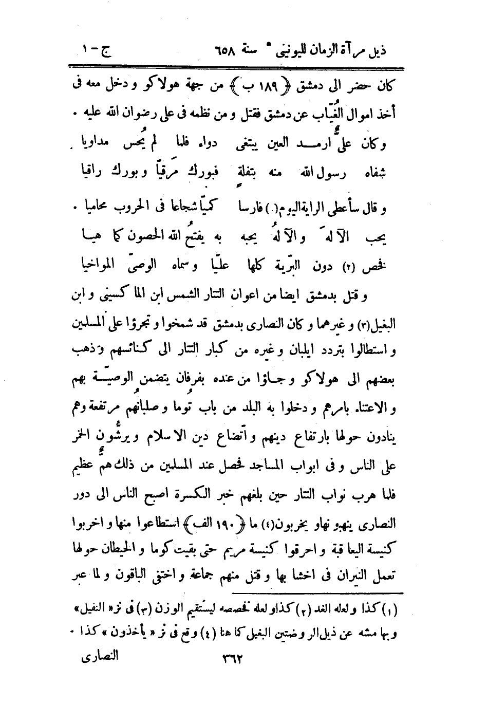 وقتل بدمشق أيضاً من أعوان التتار الشمس ابن الماكسيني وابن البغيل وغيرهما وكان النصارى بدمشق قد شمخوا وتجرؤا على المسلمين واستطالوا بتردد إيلبان وغيره من كبار التتار إلى كنائسهم وذهب بعضهم إلى هولاكو وجاؤا من عنده بفرقان يتضمن الوصية بهم والاعتناء بأمرهم ودخلوا به البلد من باب توما وصلبانهم مرتفعة وهم ينادون حولها بارتفاع دينهم واتضاع دين الإسلام ويرشون الخمر على الناس وفي أبواب المساجد فحصل عند ذلك من المسلمين هم عظيم فلما هرب نواب التتر حين بلغهم خبر الكسرة أصبح الناس إلى دور النصارى ينهبونها ويخربون ما استطاعوا منها واخربوا كنيسة اليعاقبة وأحرقوا كنيسة مريم حتى بقيت كوما والحيطان حولها تعمل النيران في أخشابها وقتل منهم جماعة واختفى الباقون ولما عبر