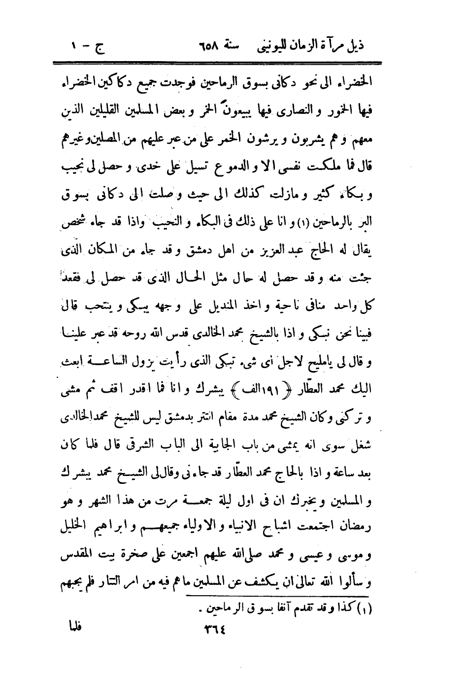 الخضراء إلى نحو دكاني بسوق الرماحين فوجدت جميع دكاكين الخضراء فيها الخمور والنصارى فيها يبيعون الخمر وبعض المسلمين القليلين الذين معهم وهم يشربون ويرشون الخمر على من عبر عليهم من المصلين وغيرهم قال فما ملكت نفسي إلا والدموع تسيل على خدي وحصل لي نحيب وبكاء كثير وما زلت كذلك إلى حيث وصلت دكاني بسوق البر بالرماحين وأنا على ذلك في البكاء والنحيب إذا قد جاء شخص يقال له الحاج عبد العزيز من أهل دمشق وقد جاء من المكان الذي جئت منه وقد حصل له حال مثل الحال الذي قد حصل لي فقعد كل واحد منا في ناحية وأخذ المنديل على وجهه يبكي وينتحب قال فبينا نحن نبكي وإذا بالشيخ محمد الخالدي قدس الله روحه قد عبر علينا وقال لي يا مليح لأجل أي شئ تبكي الذي رأيت يزول الساعة أبعث إليك محمد العطار يبشرك وأنا فما أقدر أقف ثم مشى وتركني وكان الشيخ محمد مدة مقام التتر بدمشق ليس للشيخ محمد الخالدي شغل سوى أنه يمشي من باب الجابية إلى الباب الشرقي قال فلما كان بعد ساعة إذا بالحاج محمد العطار قد جاءيني وقال لي الشيخ محمد يبشرك والمسلمين ويخبرك أن في أول ليلة الجمعة مرت من هذا الشهر وهو رمضان اجتمعت أشباح الأنبياء والأولياء جميعهم وإبراهيم الخليل وموسى وعيسى ومحمد صلى الله عليهم أجمعين على صخرة بيت المقدس وسألوا الله تعالى أن يكشف عن المسلمين ما هم فيه من أمر التتار فلم يجبهم