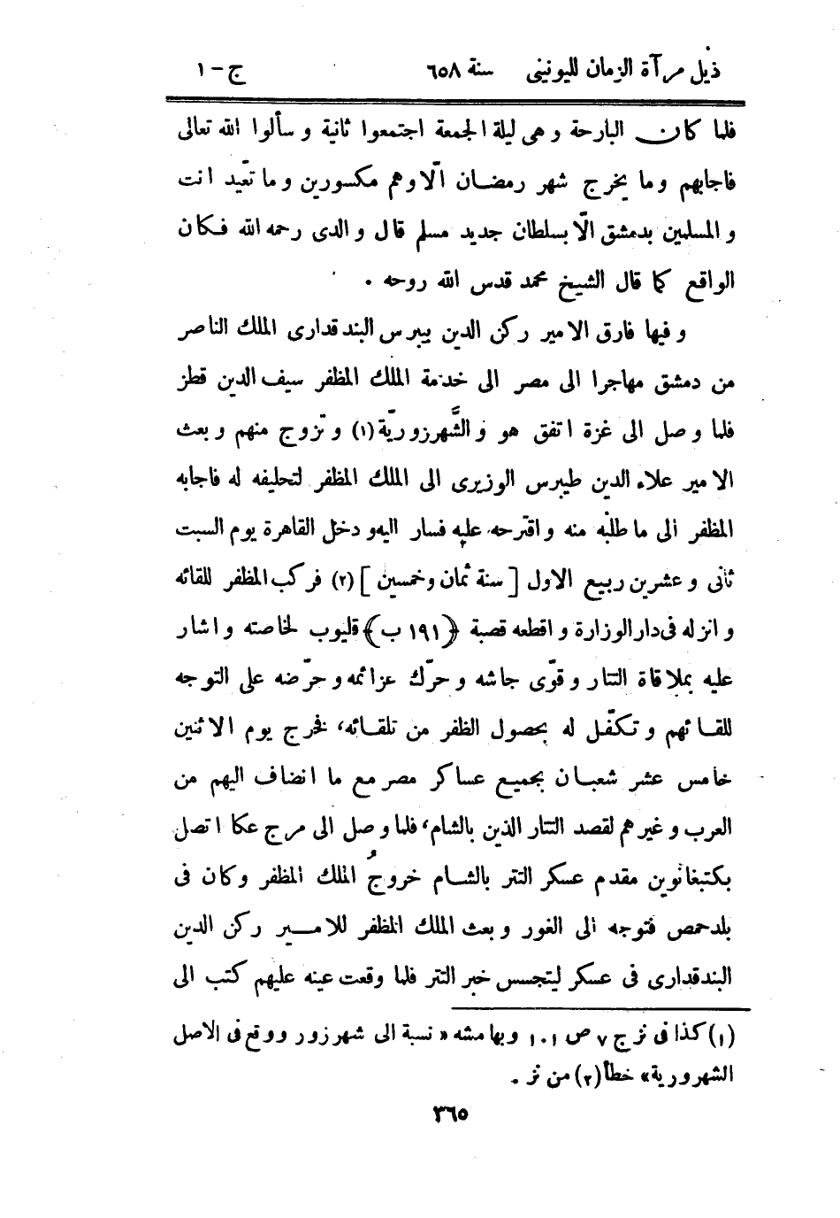 وفيها فارق الأمير ركن الدين بيبرس البندقداري الملك الناصر من دمشق مهاجراً إلى مصر إلى خدمة الملك المظفر سيف الدين قطز فلما وصل إلى غزة اتفق هو والشهرزورية وتزوج منهم وبعث الأمير علاء الدين طيبرس الوزيري إلى الملك المظفر لتحليفه له فأجابه المظفر إلى ما طلبه منه واقترحه عليه فسار إليه ودخل القاهرة يوم السبت ثاني وعشرين ربيع الأول سنة ثمان وخمسين فركب المظفر للقائه وأنزله في دار الوزارة وأقطعه قصبة قيلوب لخاصته وأشار عليه بملاقاة التتار وقوي جأشه وحرك عزائمه وحرضه على التوجه للقائهم وتكفل له بحصول الظفر من تلقائه فخرج يوم الأثنين خامس عشر شعبان بجميع عساكر مصر مع ما انضاف إليهم من العرب وغيرهم لقصد التتار الذين بالشام فلما وصل إلى مرج عكا أتصل بكتبغانوين مقدم عسكر التتر بالشام خروج الملك المظفر وكان في بلد حمص فتوجه إلى الغور وبعث الملك المظفر للأمير ركن الدين البندقداري في عسكر ليتجسس خبر التتر فلما وقعت عينه عليهم كتب إلى