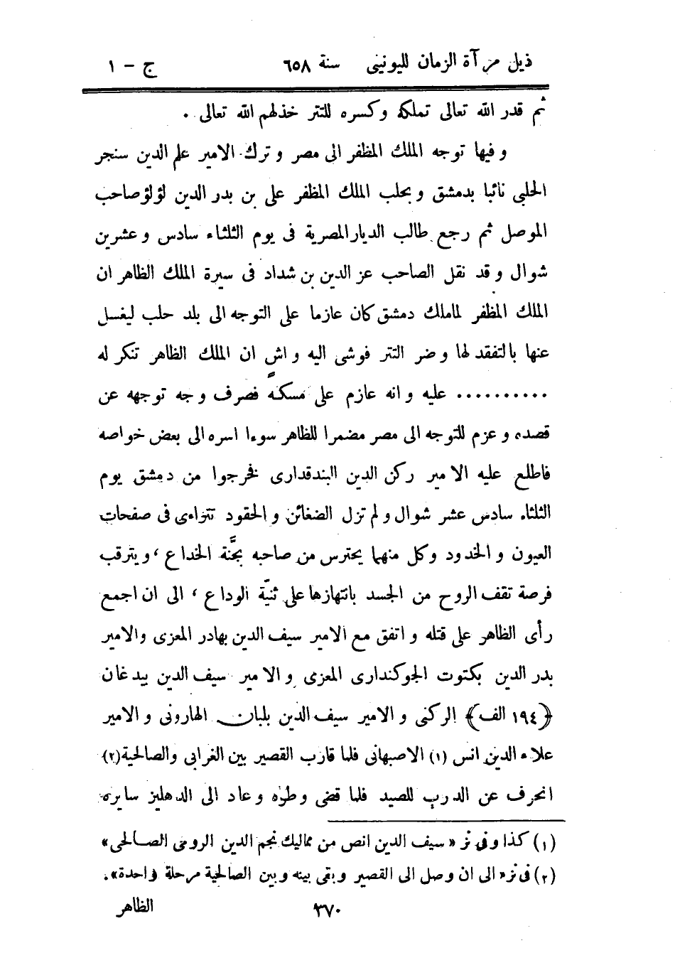 وفيها توجه الملك المظفر إلى مصر وترك الأمير علم الدين سنجر الحلبي نائباً بدمشق وبحلب الملك المظفر علي بن بدر الدين لؤلؤ صاحب الموصل ثم رجع طالب الديار المصرية في يوم الثلاثاء سادس عشرين شوال وقد نقل الصاحب عز الدين بن شداد في سيرة الملك الظاهر أن الملك المظفر لما ملك دمشق كان عازماً على التوجه إلى بلد حلب ليغسل عنها بالتفقد لها وضر التتر فوشى إليه واش أن الملك الظاهر تنكر له...... عليه وأنه عازم على مسكه فصرف وجه توجهه عن قصده وعزم للتوجه إلى مصر مضمرا للظاهر سوءاً أسره الى بعض خواصه فأطلع عليه الأمير ركن الدين البندقداري فخرجوا من دمشق يوم الثلاثاء سادس عشر من شوال ولم تزل الضغائن والحقود تتراءى في صفحات العيون والخدود وكل منهما يحترس من صاحبه بجنة الخداع ويترقب فرصة تقف الروح من الجسد بانتهازها على سنية الوداع إلى أن جمع رأي الظاهر على قتله واتفق مع الأمير سيف الدين بهادر المعزي والأمير بدر الدين بكتوت الجوكنداري المعزي والأمير سيف الدين بيدغان الركني والأمير سيف الدين بلبان الهاروني والأمير علاء الدين أنس الأصبهاني فلما قارب القصير بين الغرابي والصالحية انحرف عن الدرب للصيد فلما قضى وطره وعاد إلى الدهليز سايره