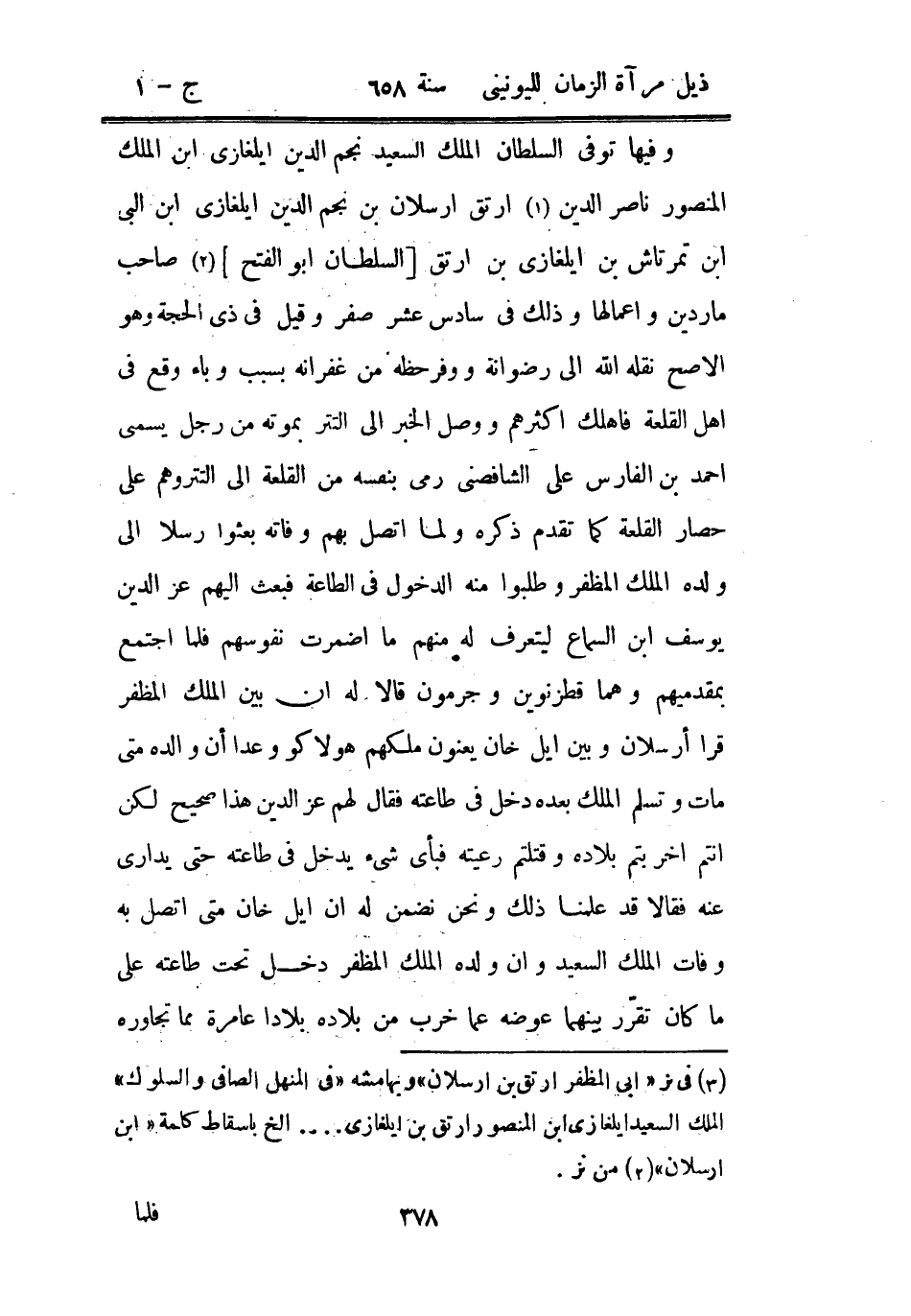 وفيها توفي السلطان الملك السعيد نجم الدين ايلغازي ابن الملك المنصور ناصر الدين أرتق أرسلان بن نجم الدين أيلغازي بن أبي تمرتاش بن أيلغازي بن أرتق السلطان أبو الفتح صاحب ماردين وأعمالها وذلك في سادس عشر صفر وقيل في ذي الحجة وهو الأصح نقله الله إلى رضوانه ووفر حظه من غفرانه بسبب وباء وقع في أهل القلعة فأهلك أكثرهم ووصل الخبر إلى التتر بموته من رجل يسمى أحمد بن فارس علي الشافصني رمى بنفسه من القلعة إلى التتر وهم على حصار القلعة كما تقدم ذكره ولما أتصل بهم وفاته بعثوا رسلا إلى ولده الملك المظفر وطلبوا منه الدخول في الطاعة فبعث إليهم عز الدين يوسف بن السماع ليتعرف له منهم ما أضمرت نفوسهم فلما اجتمع بمقدميهم وهما قطزنوين وجرمون قالا له إن بين الملك المظفر قرا أرسلان وبين أيل خان يعنون ملكهم هولاكو وعداً أن والده متى مات وتسلم الملك بعده دخل في طاعته فقال لهم عز الدين هذا صحيح لكن أنتم أخربتم بلاده وقتلتم رعيته فبأي شئ يدخل في طاعته حتى يداري عنه فقالا قد علمنا ذلك ونحن نضم له أن أيل خان متى أتصل به وفات الملك السعيد وأن ولده الملك المظفر دخل تحت طاعته على ما كان تقرر بينهما عوضه عما خرب من بلاده بلادا عامرة مما تجاوزه