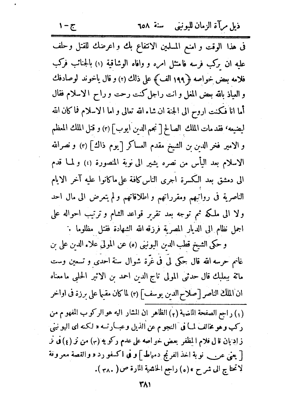في هذا الوقت وأمنع المسلمين الأنتفاع بك وأعرضك للقتل وحلف عليه أن يركب فرسه فامتثل أمره ووافاه الوشاقية بالجنائب فركب فلامه بعض خواصه على ذلك وقال يا خوند لو صادفك والعياذ بالله بعض المغل وأنت راجل كنت رحت وراح الإسلام فقال أما أنا فكنت أروح إلى الجنة إن شاء الله تعالى وأما الإسلام فما كان الله ليضيعه فقد مات الملك الصالح نجم الدين أيوب وقتل الملك المعظم والأمير فخر الدين بن الشيخ مقدم العساكر يوم ذاك ونصر الله الإسلام بعد اليأس من نصره يشير إلى نوبة المنصورة ولما قدم إلى دمشق بعد الكسرة أجرى الناس كافة على ما كانوا آخر الأيام الناصرية في رواتبهم ومقرراتهم وإطلاقاتهم ولم يتعرض إلى مال أحد ولا إلى ملكه ثم توجه بعد تقرير قواعد الشام وترتيب أحواله على أجمل نظام إلى الديار المصرية فرزقه الله الشهادة فقتل مظلوماً.