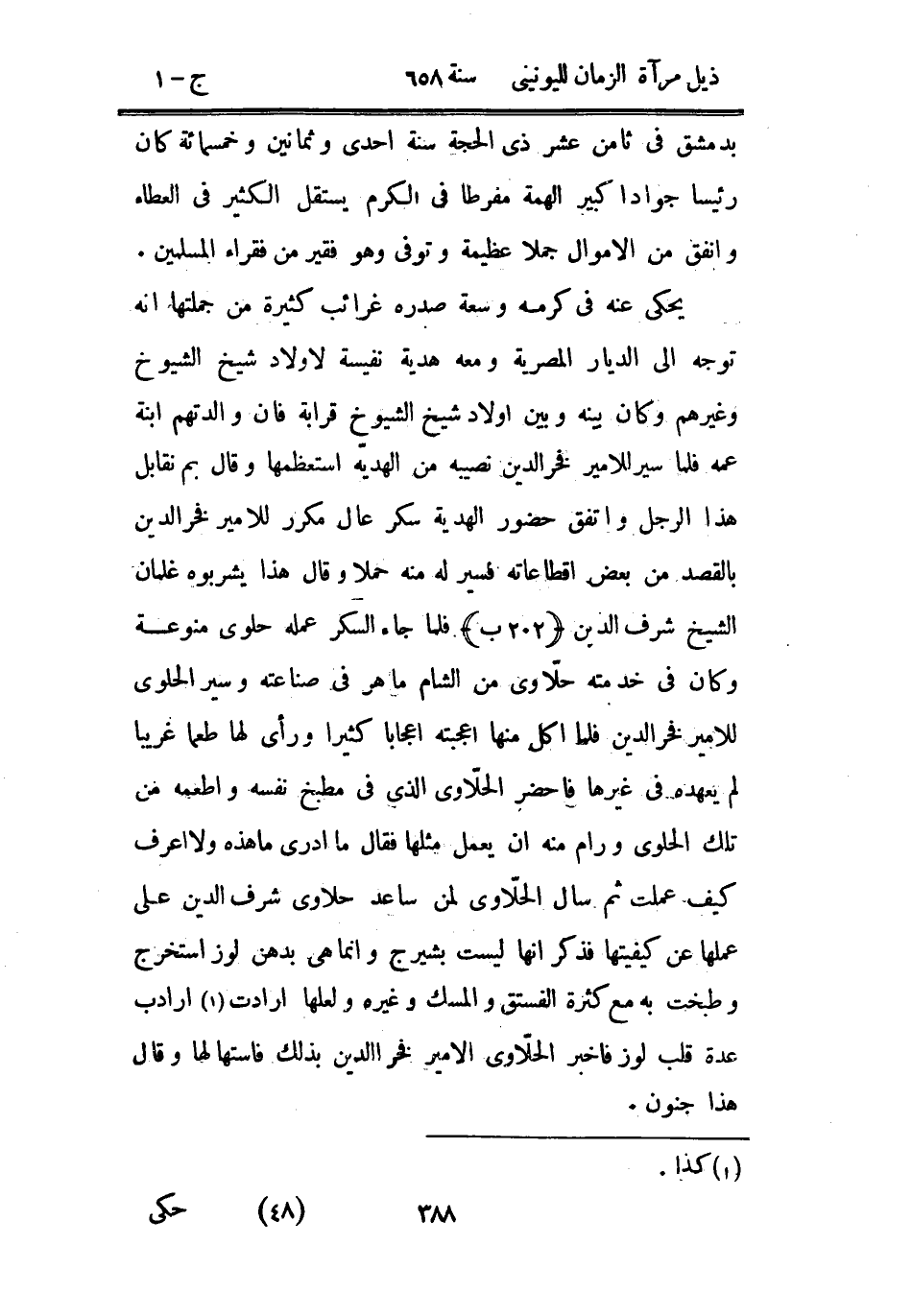 يحكى عنه في كرمه وسعة صدره غرائب كثيرة من جملتها أنه توجه إلى الديار المصرية معه هدية نفيسة لأولاد شيخ الشيوخ وغيرهم وكان بينه وبين أولاد شيخ الشيوخ قرابة فإن والدتهم أبنة عمه فلما سير للأمير فخر الدين نصيبه من الهدية استعظمها وقال بما نقابل هذا الرجل واتفق حضور الهدية سكر عال مكرر للأمير فخر الدين بالقصد من بعض اقطاعاته فسير له منه حملاً وقال هذا يشربوه غلمان الشيخ شرف الدين فلما جاء السكر عمله حلوى منوعة وكان في خدمته حلاوي من الشام ماهر في صناعته وسير الحلوى للأمير فخر الدين فلما أكل منه أعجبته أعجاباً كثيراً ورأى لها طعماً غريباً لم يعهده في غيرها فأحضر الحلاوي الذي في مطبخ نفسه وأطعمه من تلك الحلوى ورام منه أن يعمل مثلها فقال ما أدري ما هذه ولا أعرف كيف عملت ثم سال الحلاوي لمن ساعد حلاوي شرف الدين على عملها عن كيفيتها فذكر أنها ليست بشيرج وإنما هي بدهن لوز استخرج وطبخت به مع كثرة الفستق والمسك وغيره ولعلها أرادت أرادب عدة قلب لوز فأخبر الحلاوي الأمير فخر الدين بذلك فستهالها وقال هذا جنون.