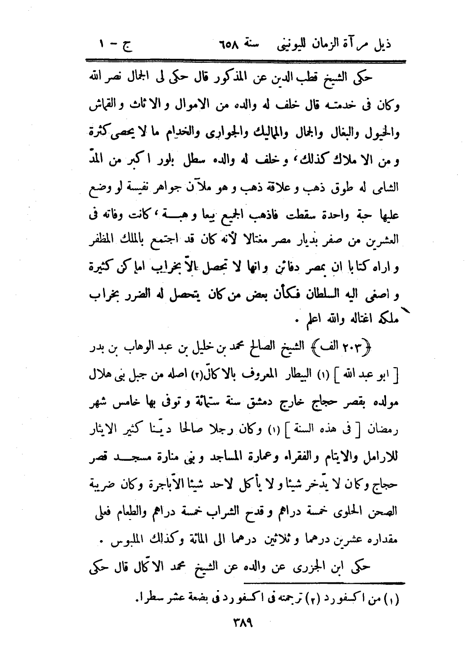 حكى الشيخ قطب الدين عن المذكور قال حكى لي الجمال نصر الله وكان في خدمته قال خلف له والده من الأموال والأثاث والقماش والخيول والبغال والجمال والمماليك والجواري والخدام ما لا يحصى كثرة ومن الأملاك كذلك إلى وخلف له والده سطل بلور أكبر من المد الشامي له طوق ذهب وعلاقة ذهب وهو ملآن جواهر نفيسة لو وضع عليها حبة واحدة سقطت فأذهب الجميع بيعاً وهبة كانت وفاته في العشرين من صفر بديار مصر مغتالاً لأنه كان قد اجتمع بالملك المظفر وأراه كتاباً أن بمصر دفائن وأنها لا تحصل إلا بخراب أماكن كثيرة وأصغى إليه السلطان فكأن بعض من كان يتحصل له الضرر بخراب ملكه اغتاله والله أعلم.