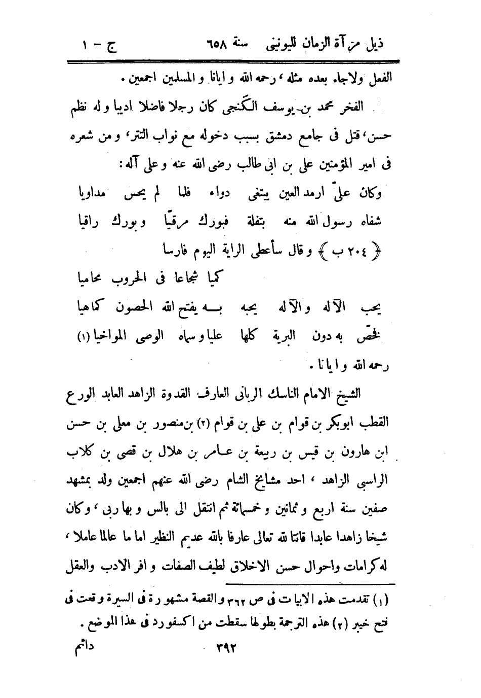 الفخر محمد بن يوسف الكنجي كان رجلاً فاضلاً أديباً وله نظم حسن قتل في جامع دمشق بسبب دخوله مع نواب التتر ومن شعره في أمير المؤمنين علي بن أبي طالب رضي الله عنه وعلى آله: