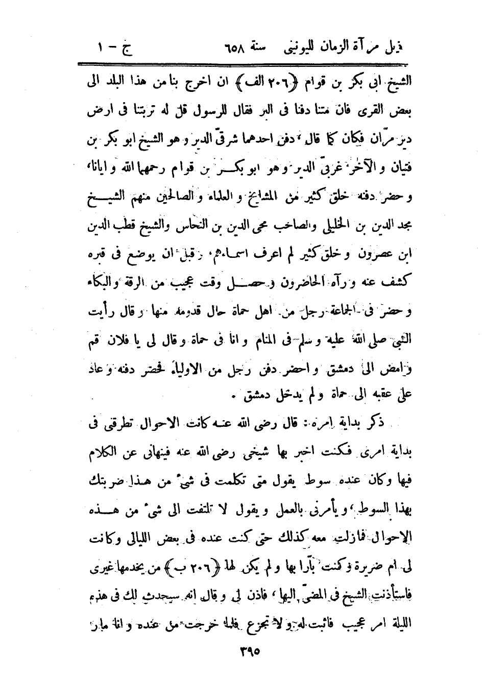 الشيخ أبي بكر بن قوام أن اخرج بنا من هذا البلد إلى بعض القرى فإن متنا دفنا في البر فقال للرسول قل له تربتنا في أرض دير مران فكان كما قال دفن أحدهما شرقي الدير وهو الشيخ أبو بكر بن فتيان والآخر غربي الدير وهو أبو بكر بن قوام رحمهما الله وإيانا وحضر دفنه خلق كثير من المشايخ والعلماء والصالحين منهم الشيخ مجد الدين بن الخليلي والصاحب محي الدين بن النحاس والشيخ قطب الدين ابن عصرون وخلق كثير لم أعرف أسماءهم وقبل أن يوضع في قبره كشف عنه ورآه الحاضرون وحصل وقت عجيب من الرقة والبكاء وحضر في الجماعة رجل من أهل حماة حال قدومه منها وقال رأيت النبي صلى الله عليه وسلم في المنام وأنا في حماة وقال لي يا فلان قم وامض إلى دمشق واحضر دفن رجل من الأولياء فحضر دفنه وعاد على عقبه إلى حماة ولم يدخل دمشق.