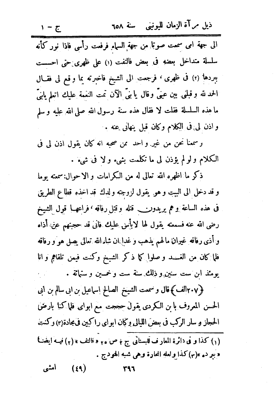 إلى جهة أمي سمعت صوتاً من جهة السماء فرفعت رأسي فإذا نور كأنه سلسلة متداخل بعضه في بعض فالتفت على ظهري حتى أحسست ببردها في صدري فرجعت إلى الشيخ فأخبرته بما وقع لي فقال الحمد لله وقبلني بين عيني وقال يا بني الآن تمت النعمة عليك أتعلم يا بني ما هذه السلسلة فقلت لا فقال هذه سنة رسول الله صلى الله عليه وسلم وأذن لي في الكلام وكان قبل ينهاني عنه.