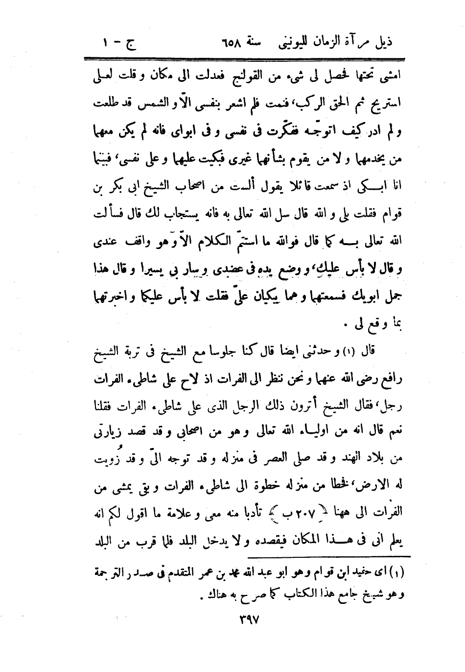 قال وحدثني أيضاً قال كنا جلوساً مع الشيخ في تربة الشيخ رافع رضي الله عنهما ونحن ننظر إلى الفرات إذ لاح على شاطئ الفرات رجل فقال الشيخ أترون ذلك الرجل الذي على شاطئ الفرات فقلنا نعم قال إنه من أولياء الله تعالى وهو من أصحابي وقد قصد زيارتي من بلاد الهند وقد صلى العصر في منزله وقد توجه إلي وقد زويت له الأرض فخطا من منزله خطوة إلى شاطئ الفرات إلى ههناتأدباً منه معي وعلامة ما أقول لكم أنه يعلم أني في هذا المكان فيقصده ولا يدخل البلد فلما قرب من البلد