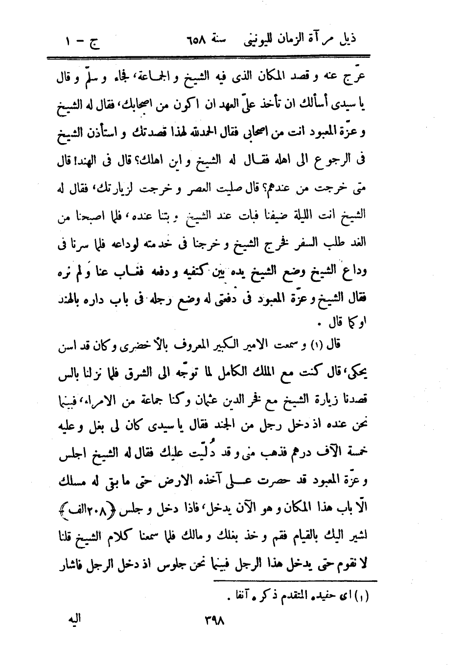 عرج عنه وقصد المكان الذي فيه الشيخ والجماعة فجاء وسلم وقال يا سيدي أسألك أن تأخذ على العهد أن أكون من أصحابك فقال له الشيخ وعزة المعبود أنت من أصحابي فقال الحمد لله لهذا قصدتك واستأذن الشيخ في الرجوع إلى أهله فقال له الشيخ وأين أهلك؟ قال في الهند قال متى خرجت من عندهم؟ قال صليت العصر وخرجت لزيارتك فقال له الشيخ أنت الليلة ضيفنا فبات عند الشيخ وبتنا عنده فلما أصبحنا من الغد طلب السفر فخرج الشيخ وخرجنا في خدمته لوداعه فلما سرنا في وداع الشيخ وضع الشيخ يده بين كتفيه ودفعه فغاب عنا ولم نره فقال الشيخ وعزة المعبود في دفعتي له وضع رجله في باب داره بالهند أو كما قال.