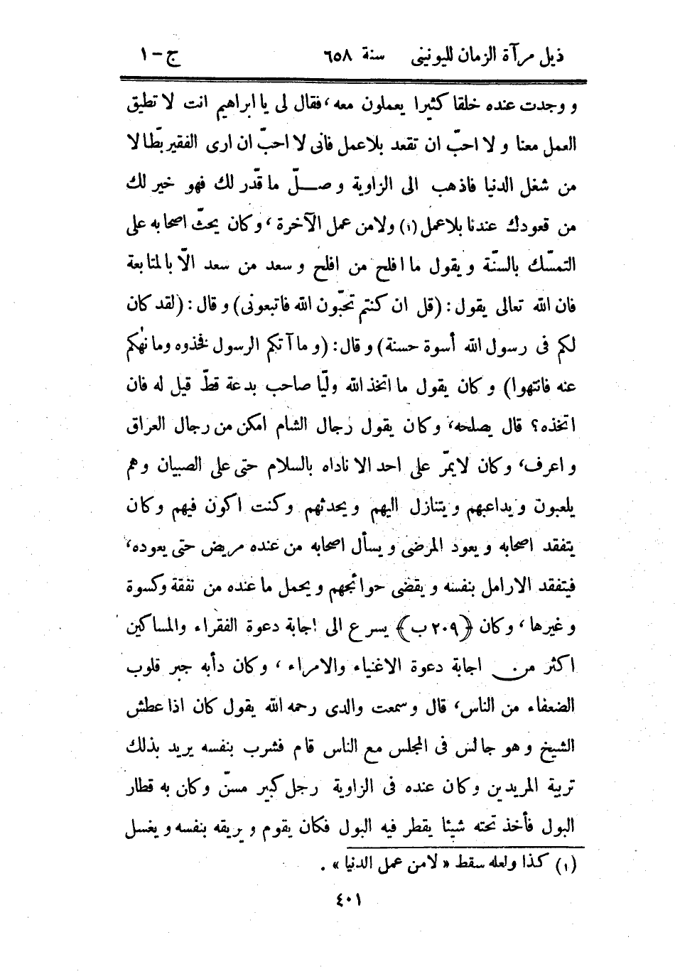 ووجدت عنده خلقاً كثيرين يعملون معه فقال لي يا إبراهيم أنت لا تطيق العمل معنا ولا أحب أن تقعد بلاب عمل فإني لا أحب أن أرى الفقير بطالاً من شغل الدنيا فاذهب إلى الزاوية وصل ما قدر لك فهو خير لك من قعودك عندنا بلا عمل ولا من عمل الآخرة وكان يحث أصحابه على التمسك بالسنة ويقول ما أفلح من أفلح ولا سعد من سعد إلا بالمتابعة فإن الله تعالى يقول (قل إن كنتم تحبون الله فاتبعوني) وقال لقد كان لكم في رسول الله أسوة حسنة وقال وما آتكم الرسول فخذوه وما نهاكم عنه فانتهوا وكان يقول ما اتخذ الله ولياً صاحب بدعة قط قيل له فإن اتخذه؟ قال يصلحه، وكان يقول رجال الشام أمكن من رجال العراق وأعرف وكان لا يمر على أحد إلا ناداه بالسلام حتى على الصبيان وهم يلعبون ويداعبهم ويتنازل إليهم ويحدثهم وكنت أكون فيهم وكان يتفقد أصحابه ويعود المرضى ويسأل أصحابه من عنده مريض حتى يعوده فيتفقد الأرامل بنفسه ويقضي حوائجهم ويحمل ما عنده من نفقة وكسوة وغيرها وكان يسرع إلى إجابة دعوة الفقراء والمساكين أكثر من إجابة دعوة الأغنياء والأمراء وكان دأبه جبر قلوب الضعفاء من الناس قال وسمعت والدي رحمه الله يقول كان إذا عطش الشيخ وهو جالس في المجلس مع الناس قام فشرب بنفسه يريد بذلك تربية المريدين وكان عنده في الزاوية رجل كبير مسن وكان به قطار البول فأتخذ تحته شيئاً يقطر فيه البول فكان يقوم ويريقه بنفسه ويغسل