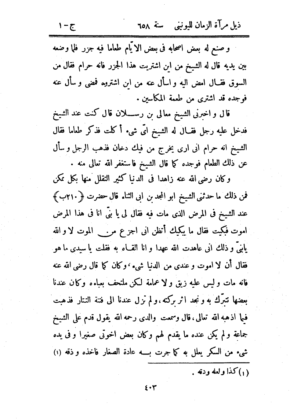وصنع له بعض أصحابه في بعض الأيام طعاماً فيه جزر فلما وضعه بين يديه قال له الشيخ من أين اشتريت هذا الجزر فإنه حرام فقال من السوق فقال امض إليه واسأل عنه من أين اشتروه فمضى وسأل عنه فوجده قد اشترى من طعمة المكاسين.