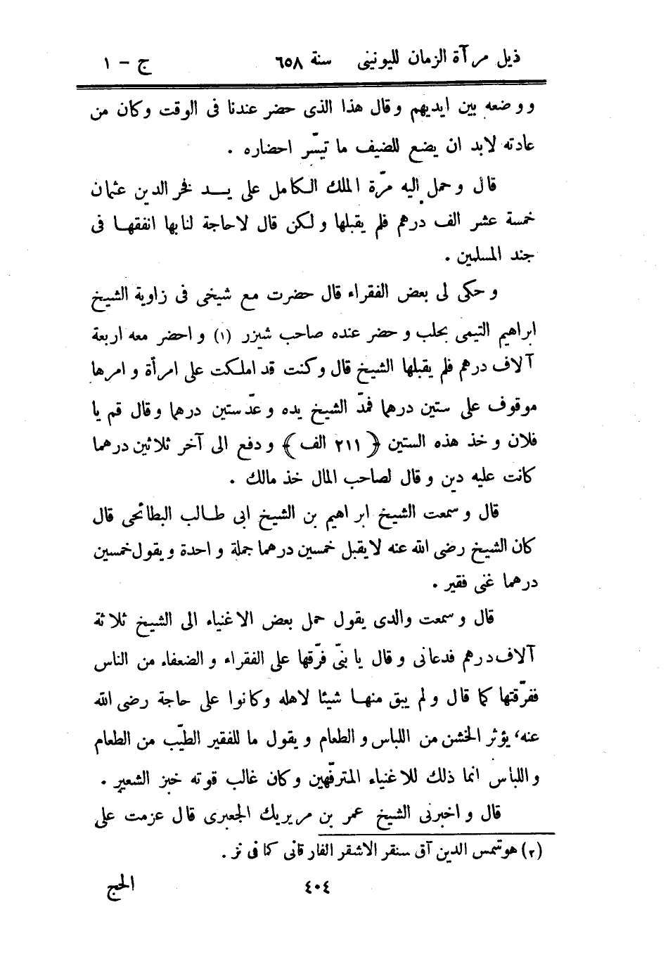 وحكى لي بعض الفقراء قال حضرت مع شيخي في زاوية الشيخ إبراهيم التيمي بحلب وحضر عنده صاحب شيزر وأحضر معه أربعة آلاف درهم فلم يقبلها الشيخ قال وكنت قد أملكت على إمرأة وأمرها موقوف على ستين درهماً فمد الشيخ يده وعد ستين درهماً وقال قم يا فلان وخذ هذه الستين ودفع إلى آخر ثلاثين درهماً كانت عليه دين وقال لصاحب المال خذ مالك.