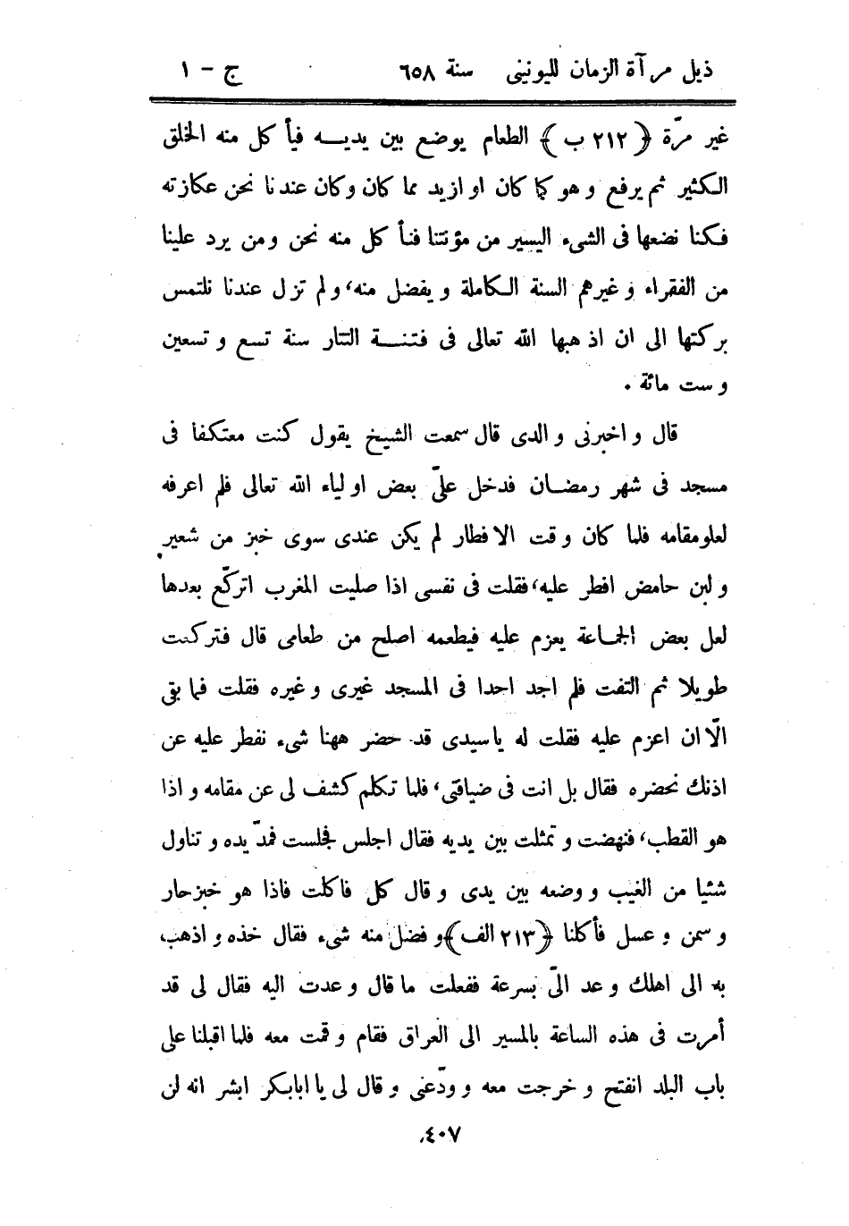 غير مرة الطعام يوضع بين يديه فيأكل منه الخلق الكثير ثم يرفع وهو كما كان أو أزيد مما كان وكان عندنا نحن عكازته فكنا نضعها في الشيء اليسير من مؤنتنا فنأكل منه نحن ومن يرد علينا من الفقراء وغيرهم السنة الكاملة ويفضل منه ولم تزل عندنا نلتمس بركتها إلى أن أذهبها الله تعالى في فتنة التتار سنة تسع وتسعين وست مائة.