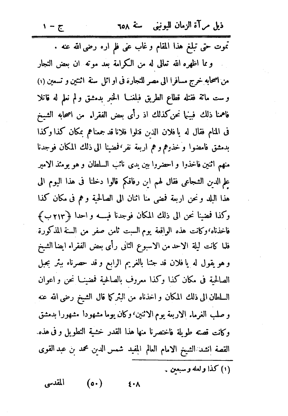 ومما أظهره الله تعالى له من الكرامة بعد موته أن بعض التجار من أصحابه خرج مسافراً إلى مصر للتجارة في أوائل سنة اثنتين وتسعين وستمائة فقتله قطاع الطريق فبلغنا الخبر بدمشق ولم نعلم له قاتلاً فبينما نحن كذلك إذ رأى بعض الفقراء من أصحابه الشيخ في المنام فقال له يا فلان الذين قتلوا فلاناً قد جمعناهم بمكان كذا وكذا بدمشق فامضوا وخذوهم وهم أربعة نفر فمضينا إلى ذلك المكان فوجدنا منهم اثنين فأخذوا وأحضروا بين يدي نائب السلطان وهو يومئذ الأمير علم الدين الشجاعي فقال لهم أين رفاقكم قالوا دخلنا في هذا اليوم إلى هذا البلد ونحن أربعة فمضى منا اثنان إلى الصالحية وهم في مكان كذا وكذا فمضينا نحن إلى ذلك المكان فوجدنا فيه واحداً فأخذناه وكانت هذه الواقعة يوم السبت ثمان صفر من السنة المذكورة فلما كانت ليلة الأحد من الأسبوع الثاني رأى بعض الفقراء أيضاً الشيخ وهو يقول يا فلان قد جئنا بالغريم الرابع وقد حصرناه في بئر في جبل الصالحية في مكان كذا وكذا معروف بالصالحية فمضينا نحن وأعوان السلطان إلى ذلك المكان وأخذناه من البئر كما قال الشيخ رضي الله عنه وصلب الغرماء الأربعة يوم الأثنين، وكان يوماً مشهوداًمشهوراً بدمشق وكانت قصته طويلة فأختصرنا منها هذا القدر خشية التطويل وفي هذه القصة أنشد الشيخ الإمام العالم المفيد شمس الدين محمد بن عبد القوي