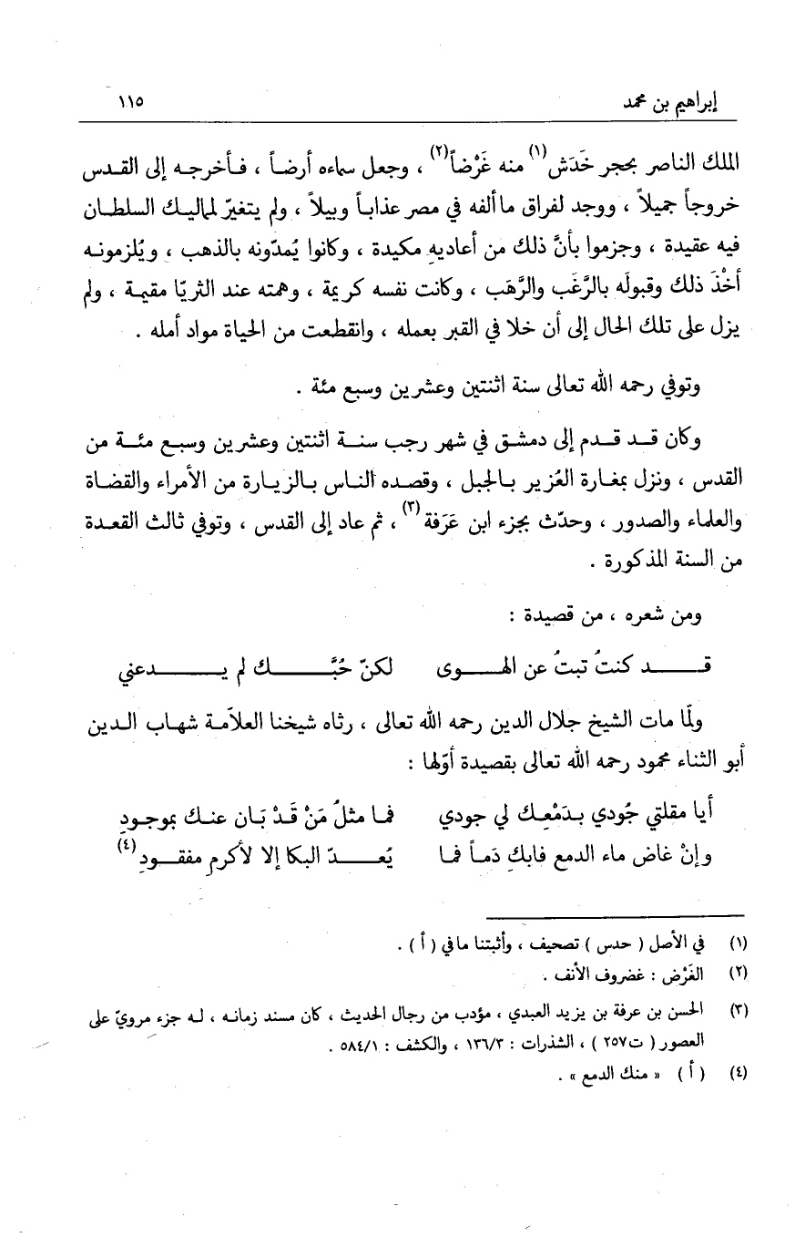 الملك الناصر بحجر خدش منه غرضاً، وجعل سماءه أرضاً، فأخرجه إلى القدس خروجاً جميلاً، ووجد لفراق ما ألفه في مصر عذاباً وبيلاً، ولم يتغير لمماليك السلطان فيه عقيدة، وجزموا بأن ذلك من أعاديه مكيدة، وكانوا يمدونه بالذهب، ويلزمونه أخذ ذلك وقبوله بالرغب والرهب، وكانت نفسه كريمة، وهمته عند الثريا مقيمة، ولم يزل على تلك الحال إلى أن خلا في القبر بعمله، وانقطعت من الحياة مواد أمله.