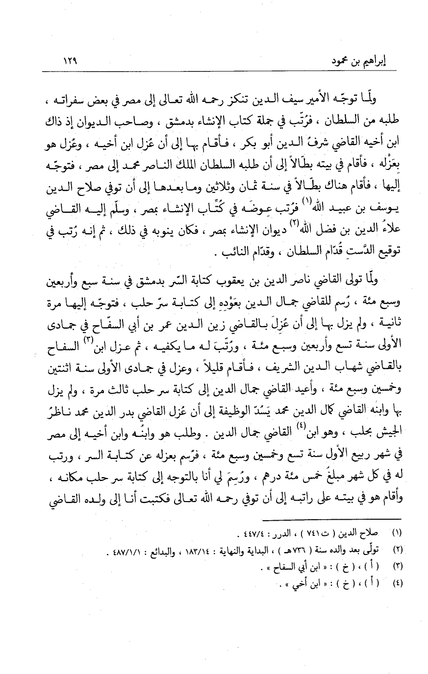 ولما تلوى القاضي ناصر الدين بن يعقوب كتابة السر بدمشق في سنة سبع وأربعين وسبع مئة، رسم للقاضي جمال الدين بعوده إلى كتابة سر حلب، فتوجه إليها مرة ثانية، ولم يزل بها إلى أن عزل بالقاضي زين الدين عمر بن أبي السفاح في جمادى الأولى سنة تسع وأربعين وسبع مئة، ورتبَ له ما يكفيه، ثم عزل ابن السفاح بالقاضي شهاب الدين الشريف، فأقام قليلاً، وعزل في جمادى الأولى سنة اثنتين وخمسين وسبع مئة، وأعيد القاضي جمال الدين إلى كتابة سر حلب ثالث مرة، ولم يزل بها وابنه القاضي كمال الدين محمد يسد الوظيفة إلى أن عزل القاضي بدر الدين محمد ناظرُ الجيش بحلب، وهو ابن القاضي جمال الدين. وطلب هو ابنه وابن أخيه إلى مصر في شهر ربيع الأول سنة تسع وخمسين وسبع مئة، فرسم بعزله عن كتابة السر، ورتب له في كل شهر مبلغ خمس مئة درهم، ورسم لي أنا بالتوجه إلى كتابة سر حلب مكانه، وأقام هو في بيته على راتبه إلى أن توفي رحمه الله تعالى فكتبت أنا إلى ولده القاضي