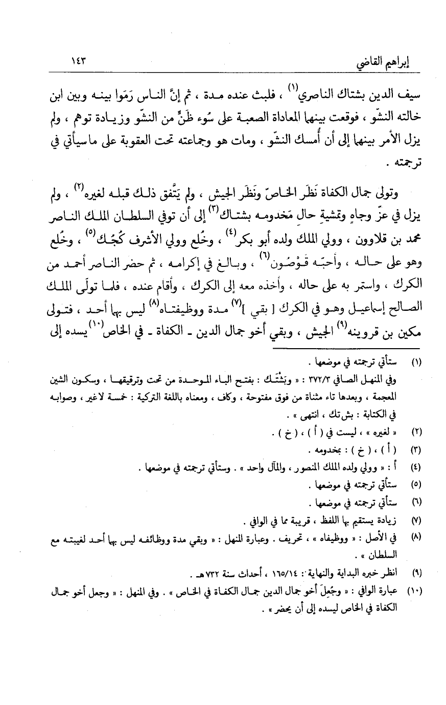 وتولى جمال الكفاة نظر الخاص ونظر الجيش، ولم يتفق ذلك قبله لغيره، ولم يزل في عز وجاهٍ وتمشيةِ حالِ مخدومه بشتاك إلى أن توفي السلطان الملك الناصر محمد بن قلاوون، وولي الملك ولده أبو بكر، وخلع وولي الأشرف كجك، وخلع وهو على حاله، وأحبه قوصون، وبالغ في إكرامه، ثم حضر الناصر أحمد من الكرك، واستمر به على حاله، وأخذه معه إلى الكرك، وأقام عنده، فلما تولى الملك الصالح إسماعيل وهو في الكرك بقي مدة ووظيفتاه ليس بهما أحد، فتولى مكين بن قروينه الجيش، وبقي أخو جمال الدين - الكفاة - في الخاص يسده إلى