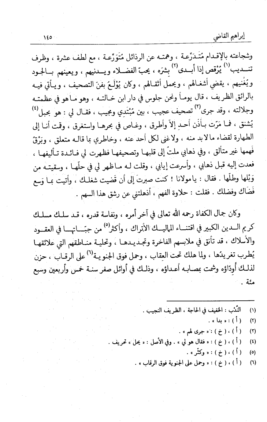 وشجاعته بالإقدام متدرعة، وهمته عن الرذائل متورعة، مع لطف عشرة، وظرف تنديب يرقص إذا أبدى بشره، يحب الفضلاء ويدنيهم، ويعينهم بالجود ويغنيهم، يقضي أشغالهم، ويحمل أثقالهم، وكان يولعُ بفن التصحيف، ويأتي فيه بالرائق الظريف، قال يوماً ونحن جلوس في دار ابن خالته، وهو ما هو في عظمته وجلالته، وقد جرى تصحيف عجيب، بين مبتدي ومجيب، فقال لي: هو بحبل يشنق، فما مرت بأذن أحد إلا وأطرق، وغاص في بحرها واستغرق، وقمت أنا إلى الطهارة لقضاء ما لا بد منه، ولا غنى لكل أحد عنه، وخاطري بما قاله متعلق، وبرقُ فهمها غير متألق، وفي ذهابي ملتُ إلى قلبها وتصحيفها فظهرت لي فائدة تأليفها، فعدت إليه قبل ذهابي ملتُ إلى قلبها وتصحيفها فظهرت لي فائدة تأليفها، فعدت إليه قبل ذهابي، وأسرعت إيابي، وقلت له ما ظهر لي في حلها، وسقيته من وبلها وطلها. فقال: يا مولانا! كنت صبرت إلى أن قضيت شغلك، وأتيت بما وسع فضاك وفضلك. فقلت: حلاوة الفهم، أذهلتني عن رشق هذا السهم.