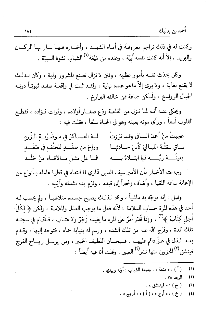 وقيل: إنه توجه به ماشياً، وكاد لذلك يصبح جسده متلاشياً، ولم يحسب له أحد في هذه المرة حساب السلامة، لأنه فعل ما يوجب العذل والملامة، ولكن " لكل أجل كتاب "، وإذا قدر أمرٌ على المرء ما يفيده زجرٌ ولا عتاب، فأقام في سجنه تلك المدة، وفرّج الله عنه من تلك الشدة، ورسم له بنيابة حماه، فتوجه إليها، وقدم بعد الذل في عز دائم عليها، فسبحان اللطيف الخبير، ومن يرسل رياح الفرج فينشق المحزون منها نشر العبير. وقلت أنا فيه أيضاً: