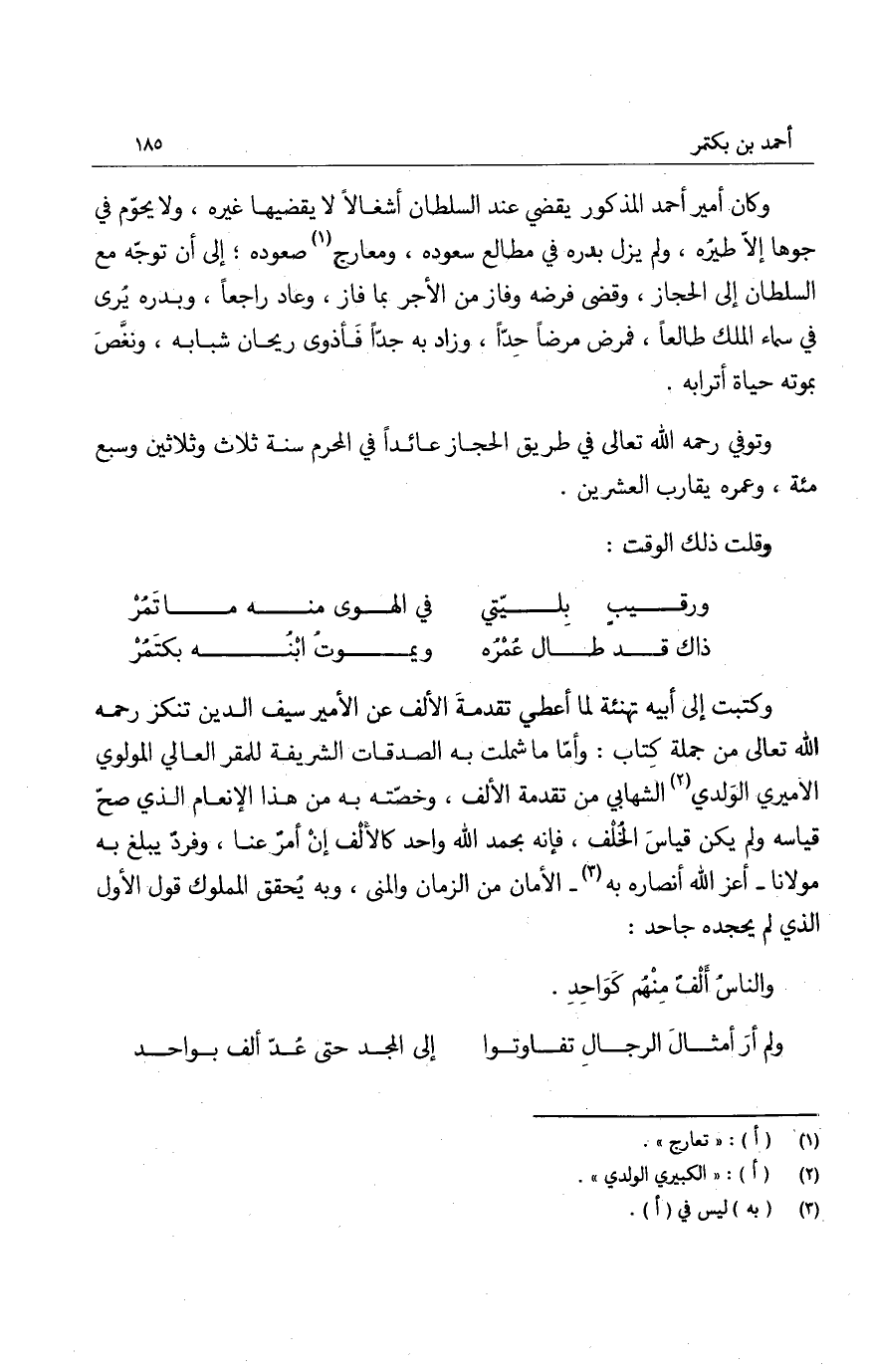 وكان أمير أحمد المذكور يقضي عند السلطان أشغالاً لا يقضيها غيره، ولا يحوم في جوها إلا طيره، ولم يزل بدره في مطلع سعوده، ومعارج صعوده، إلى أن توجه مع السلطان إلى الحجاز، وقضى فرضه وفاز من الأجر بما فاز، وعاد راجعاً، وبدره يُرى في سماء الملك طالعاً، فمرض مرضاً حداً، وزاد به جداً فأذوى ريحان شبابه، ونغص بموته حياة أترابه.