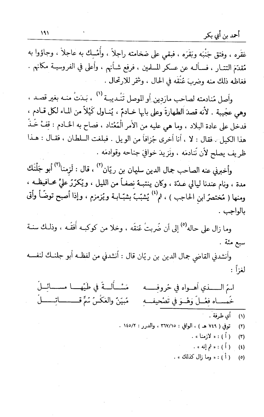 وأصل منادمته لصاحب ماردين أو الموصل تنديبة، بدت منه بغير قصد، وهي عجيبة. لأنه قصد الطهارة وعلى بابها خادمٌ، يناول كيلاً من الماء لكل قادم، فدخل على عادة البلاد، وما هي عليه من الأمر المعتاد، فصاح به الخادم قف خذ هذا الكيل. قال: لا، أنا أخرى جزافاً من الويل. فبلغت السلطان، فقال: هذا ظريف يصلح لأن ننادمه، ونزيد خوافي جناحه وقوادمه.