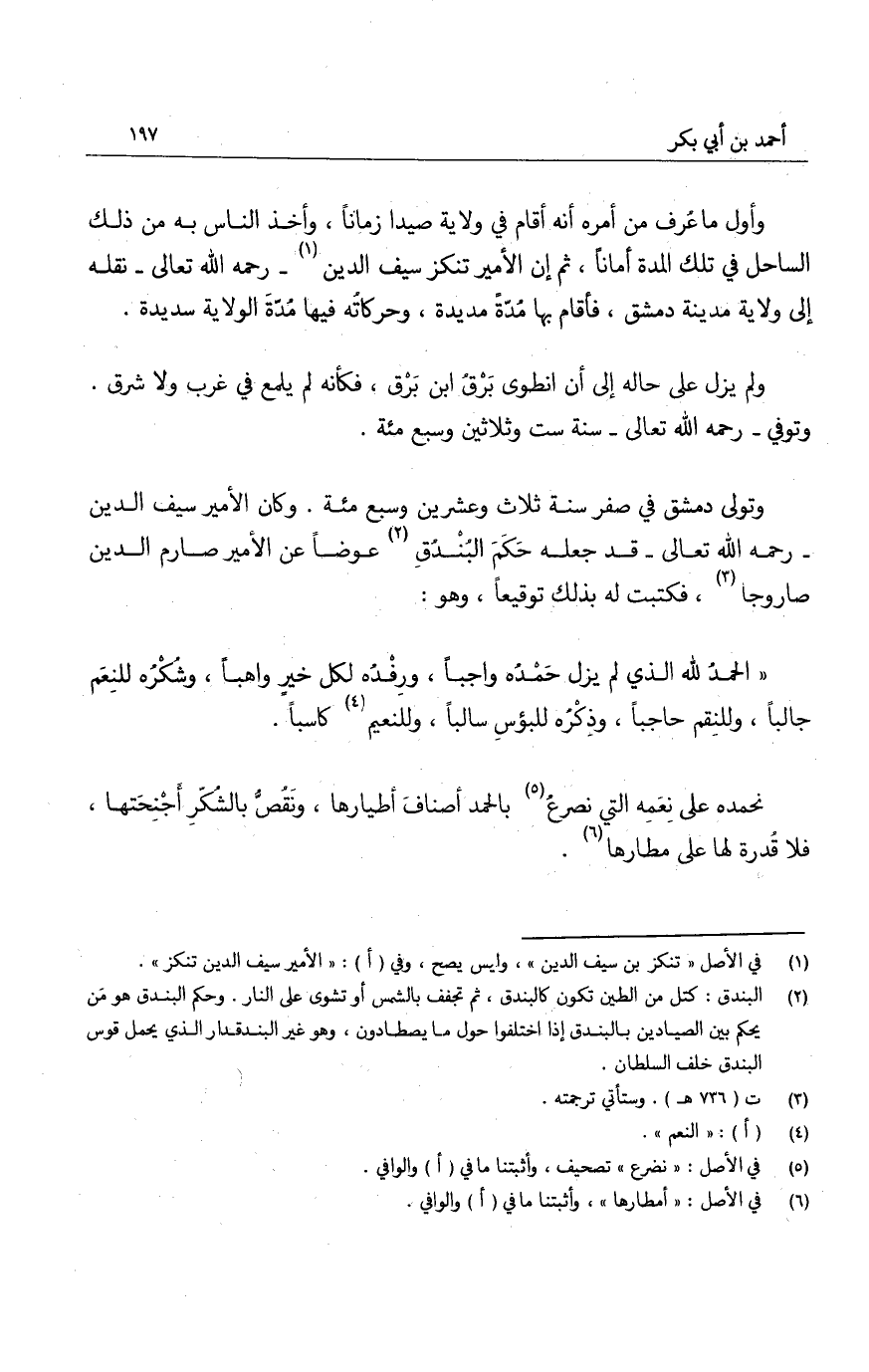 وتولى دمشق في صفر سنة ثلاث وعشرين وسبع مئة. وكان الأمير سيف الدين - رحمه الله تعالى - قد جعله حكم البندقِ عوضاً عن الأمير صارم الدين صاروجا، فكتبت له بذلك توقيعاً، وهو: الحمد لله الذي لم يزل حمده واجباً، وفدهُ لكل خير واهباً، وشكره للنعم جالباً، وللنقم حاجباً، وذكره للبؤس سالباً، وللنعيم كاسباً.