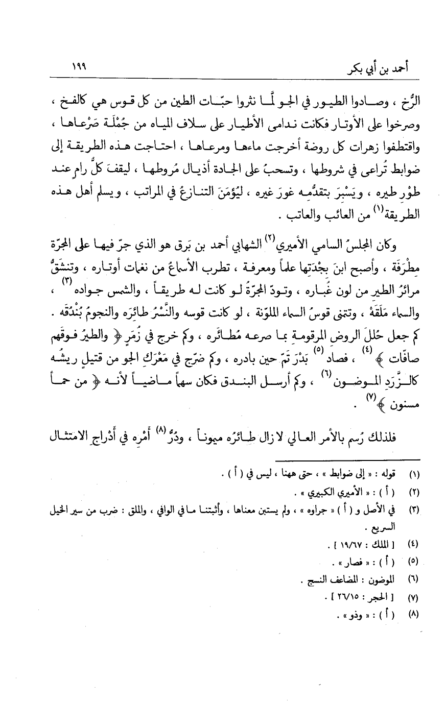 وكان المجلسُ السامي الأميري الشهابي أحمد بن برق هو الذي جر فيها على المجرة مطرفة، وأصبح ابن بجدتها علماً ومعرفة، تطرب الأسماعُ من نغمات أوتاره، وتنشق مرائرُ الطير من لون غُباره، وتودّ المجرةُ لو كانت له طريقاً، والشمس جواده، والسماء ملقه، تتمنى قوسُ السماء الملوّنة، لو كانت قوسه والنسرُ طائره والنجوم بندقه. كم جعل حُلل الروض المرقومةِ بما صرعه مصائره، وكم خرج في زمرٍ والطير فوقهم صافات، فصاد بدر تم حين بادره، وكم ضرج في معركِ الجو من قتيلٍ ريشُه كالزرد الموضون، وكم أرسل البندق فكان سهماً ماضياً لأنه " من حمئ مسنون ".