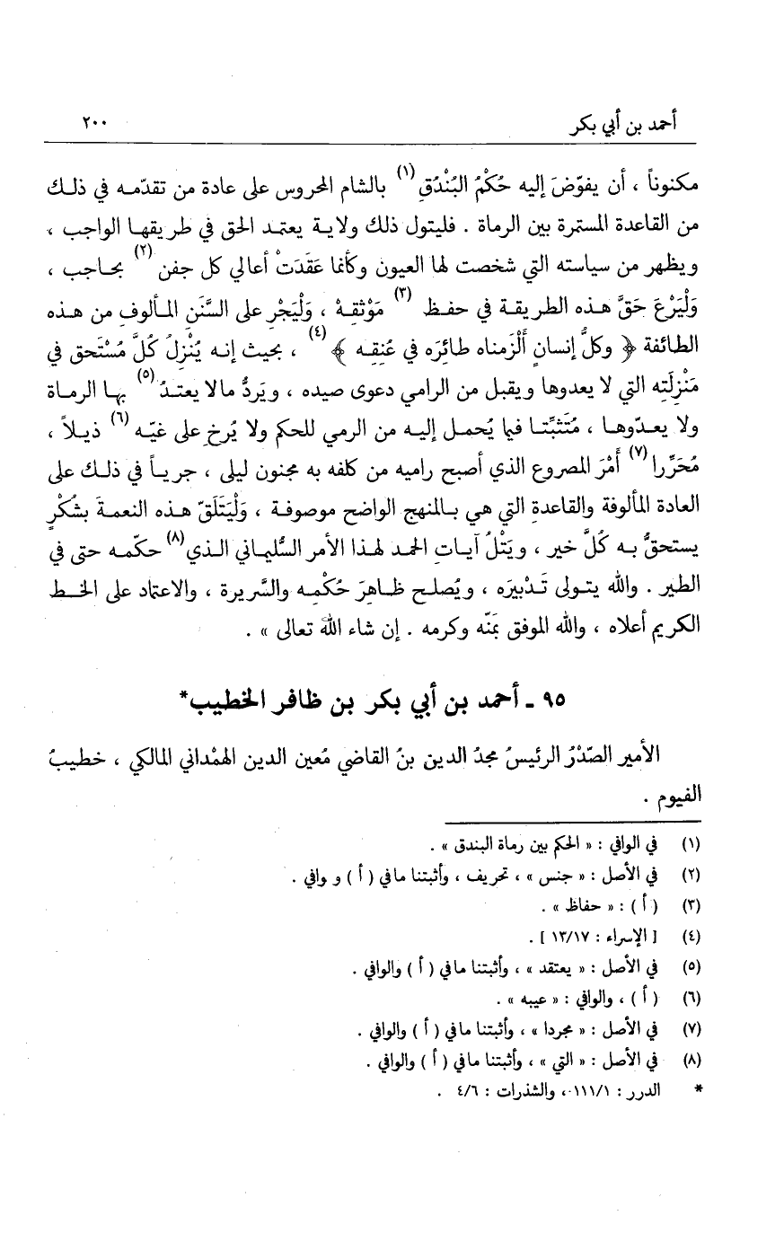 مكنوناً، أن يفوضَ إليه حكم البندقِ بالشام المحروس على عادة من تقدمه في ذلك من القاعدة المستمرة بين الرماة. فليتول ذلك ولاية يعتمد الحق في طريقها الواجب، ويظهر من سياسته التي شخصت لها لعيون وكأنما عقدت أعالي كل جفن بحاجب، وليرعَ حق هذه الطريقة في حفظ موثقه، وليجر على السنن المألوف من هذه الطائفة " وكل إنسان ألزمناه طائره في عنقه "، بحيث إنه ينزلُ كل مستحق في منزلته التي لا يعدوها ويقبل من الرامي دعوى صيده، ويرد ما لا يعتدُ بها الرماة ولا يعدوها، ومتثبتاً فيما يحمل إليه من الرمي للحكم ولا يرخ على غيه ذيلاً، محرراً أمر المصروع الذي أصبح راميه من كلفه به مجنون ليلى، جرياً في ذلك على العادة المألوفة والقاعدة التي هي بالمنهج الواضح موصوفة، وليتلقَ هذه النعمة بشكر يستحق به كل خير، ويتلُ آيات الحمد لهذا الأمر السليماني الذي حكمه حتى في الطير. والله يتولى تدبيره، ويُصلح ظاهر حكمه والسريرة، والاعتماد على الخط الكريم أعلاه، الله الموفق بمنه وكرمه. إن شاء الله تعالى.