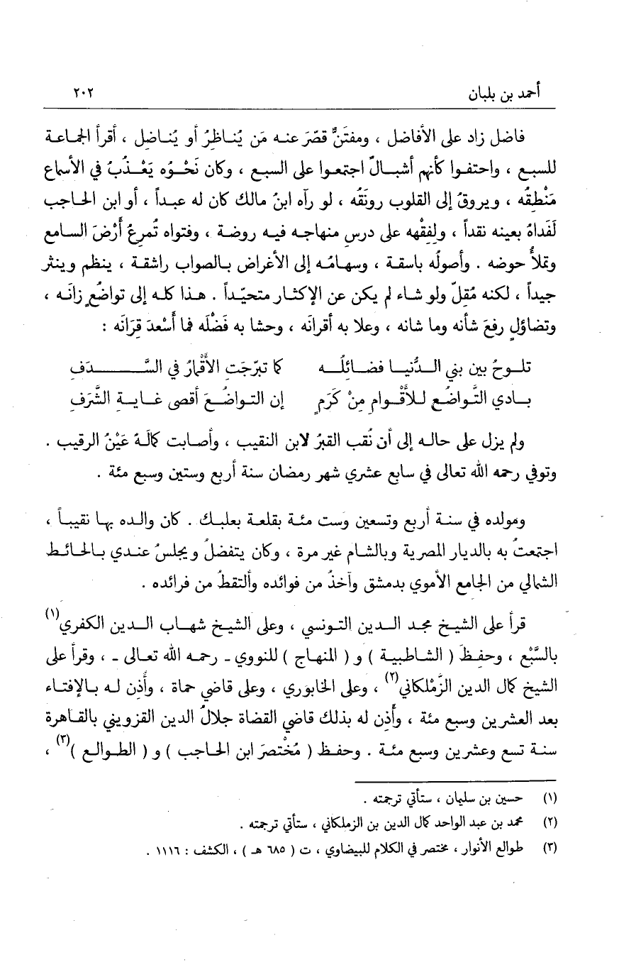 ومولده في سنة أربع وتسعين وست مئة بقلعة بلعبك. وكان والده بها نقيباً، واجتمعتُ به بالديار المصرية بالشام غير مرة، وكان يتفضلُ ويجلسُ عندي بالحائط الشمالي من الجامع الأموي بدمشق وآخذُ من فوائده وألتقط من فرائده.