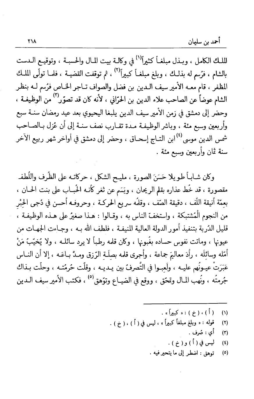 وكان شاباً طويلاً حسن الصورة، مليح الشكل، حركاته على الظرف واللطف مقصورة، قد خط عذاره بقلم الريحان، وبسم عن ثغر كأنه الحُباب على بنت الحان، بعمة أنيقة اللف، دقيقة الصف، وقلُمه سريع الحركة، وحروفه أحسن في دُجى الحبر من النجوم المشتبكة، واستخف الناس به، وقالوا: هذا صغيرٌ على هذه الوظيفة، قليل الدربة بتنفيذ أمور الدولة العالية المنيفة، فلطف الله به، وجاءت الجهات من عيونها، وماتت نفوس حساده بغبونها، وكان قلمه رطباً لا يرد سائله، ولا يخيبُ من أمله وسائله، رأد معاليم جماعة، وأجرى قلمه بصلةِ الرزق ومد باعه، إلا أن الناس عبرت عيونُهم عليه، ولعبوا في التصريف بين يديه، وقلت حرمته، وحلت بذاك جرمته، ونهب المال وتمحق، ووقع في الضياع وتوهق، فكتب الأمير سيف الدين