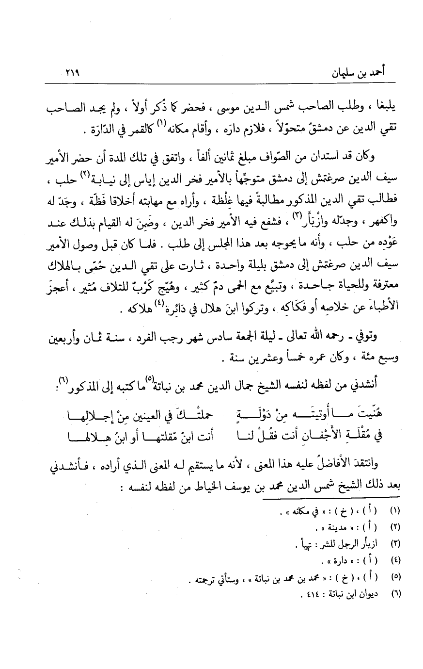 وكان قد استدان من الصواف مبلغ ثمانين ألف، واتفق في تلك المدة أن حضر الأمير سيف الدين صرغتمش إلى دمشق متوجهاً بالأمير فخر الدين إياس إلى نيابة حلب، فطالب تقي الدين المذكور مطالبةً فيها غلظة، وأراه مع مهابته أخلاقاً فظة، وجدّ له واكفهر، وجدّ له وازبأر، فشفع فيها غلظة، وأراه مع مهابته أخلاقاً فظة، وجد له عوده من حلب، وأنه ما يحوجه بعد هذا المجلس إلى طلب. فلما كان قبل وصول الأمير سيف الدين صرغتمش إلى دمشق بليلة واحدة، ثارت على تقي الدين حمى بالهلاك معترفة وللحياة جاحدة، وتبيع مع الحمى دمٌ كثير، وهيج كربٌ للتلاف مثير، أعجز الأطباء عن خلاصة أو فكاكه، وتركوا ابن هلال في دائره هلاكه.