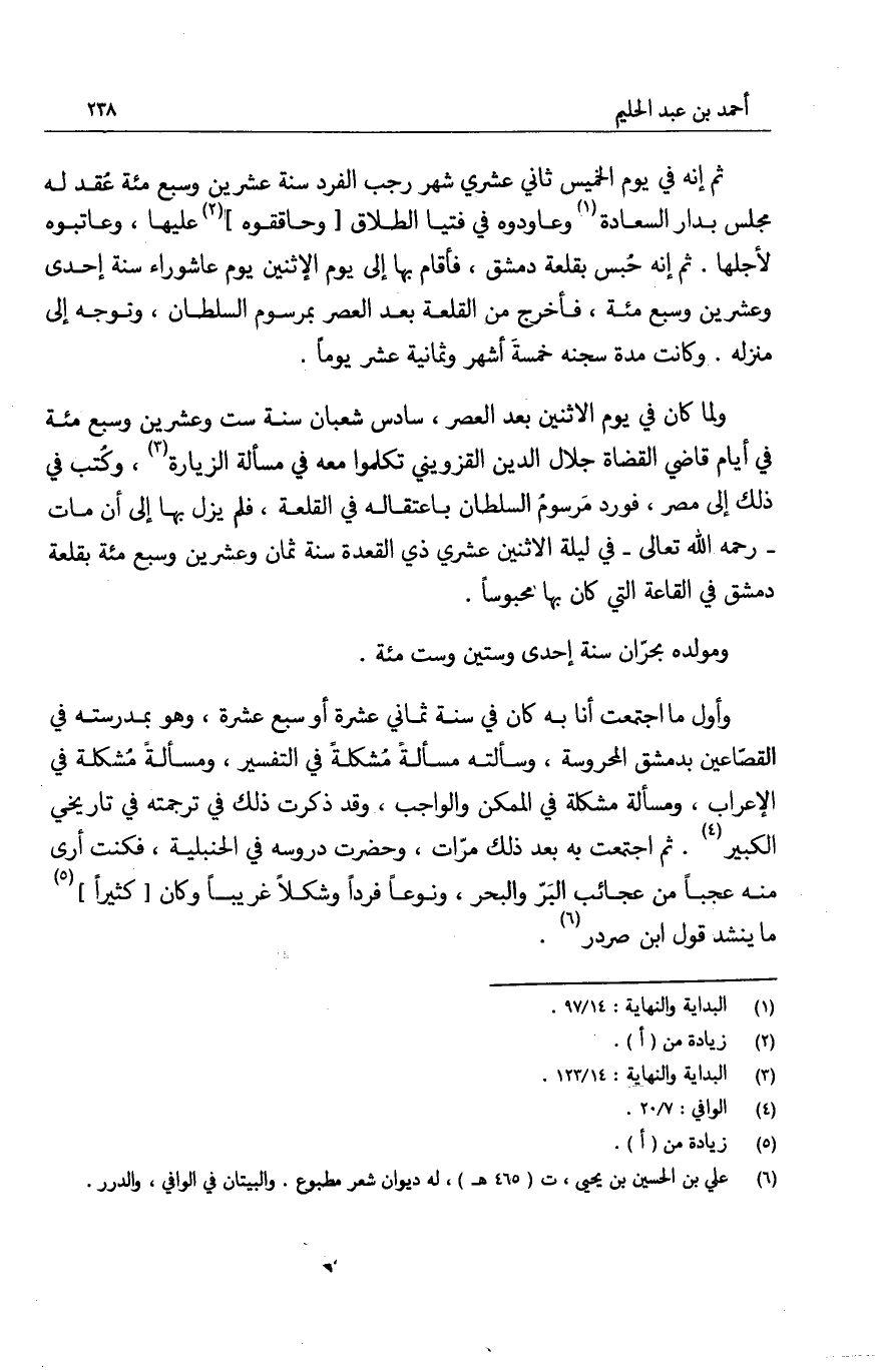 وأول ما اجتمعت أنا به كان في سنة ثماني عشرة، وهو بمدرسته في القصاعين بدمشق المحروسة، وسألته مسألة مشكلةً في التفسير في الإعراب، ومسألة مشكلة في الممكن والواجب، وقد ذكرت ذلك في ترجمته في تاريخي الكبير. ثم اجتمعت به بعد ذلك مرّات، وحضرت دروسه في الحنبلية، فكنت أرى منه عجباً من عجائب البرّ والبحر، ونوعاً فرداً وشكلاً غريباً وكان كثيراً ما ينشد قول ابن صردر.
