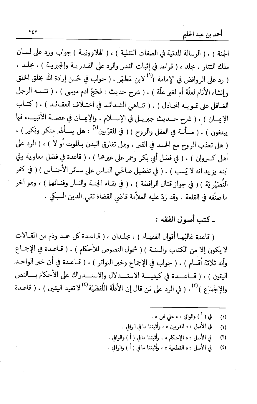 " قاعدة غالبُها أقوال الفقهاء "، مجلدان، " قاعدة كل حمد وذم من المقالات لا يكون إلا من الكتاب والسنة " " شمول النصوص للأحكام "، " قاعدة في الإجماع وأنه ثلاثة أقسام "، " جواب في الإجماع وخبر التواتر "، " قاعدة في أن خبر الواحد اليقين "، " قاعدة في كيفية الاستدلال والاستدراك على الأحكام بالنص والإجْمَاع "، " في الرد على من قال إن الأدلة اللَّفظيّة لا تفيد اليقين "، " قاعدة