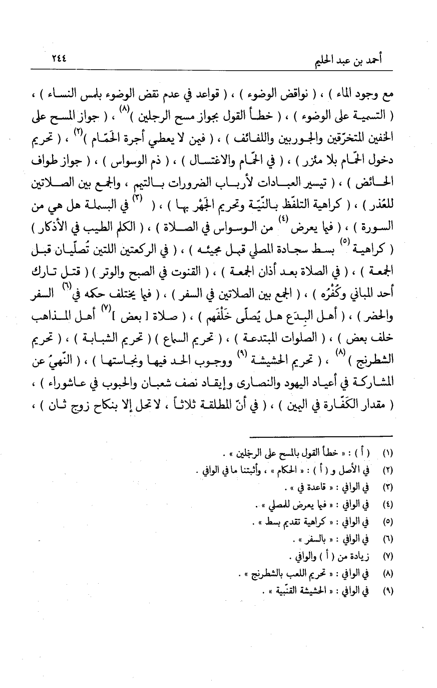 مع وجود الماء "، " نواقض الوضوء "، " قواعد في عدم نقض الوضوء بلمس النساء "، " التسمية على الوضوء "، " خطأ القول بجواز مسح الرجلين "، " جواز المسح الخفين المتخرّقين والجوربين واللفائف "، " فيمن لا يعطي أجرة الحَمّام "، " تحريم دخول الحمّام بلا مُبرر "، " في الحمّام والاغتسال "، " ذم الوسواس "، " جواز طواف الحائض "، " تيسير العبادات لأرباب الضروريات بالتيمم، والجمع بين الصلاتين للعُذر "، " كراهية التلفّظ بالنّيّة وتحريم الجَهْر بها "، " في البسملة هل هي من السورة "، " فيما يعرض من الوسواس في الصلاة "، " الكلم الطيب في الأذكار " " كراهية بسط سجادة المصلي قبل مجيئه "، " في الركعتين اللتين تُصلّيان قبل الجمعة "، " في الصلاة بعد أذان الجمعة "، " القنوت في الصبح والوتر " " قتل تارك أحد المباني وكُفره "، " الجمع بين الصلاتين في السفر "، " فيما يختلف حكمه في السفر والحضر "، " أهل البِدَع هل يُصلّى خلفهم "، " صلاة بعض أهل المذاهب خلف بعض "، " الثلوات المبتدعة "، " تحريم السماع " " تحريم الشبابة "، " تحريم الشطرنج "، " تحريم الحشيشة ووجوب الحد فيها ونجاستها "، " النّهيُ عن المشاركة في أعياد اليهود والنصارى وإيقاد نصف شعبان والحبوب في عاشوراء "، " مقدار الكَفّارة في اليمين "، " في أنّ المطلقة ثلاثاً، لا تحل إلا بنكاح زوج ثان "، "