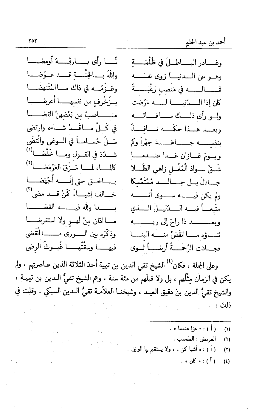 وعلى الجملة، فكان الشيخ تقي الدين بن تيمية أحد الثلاثة الذين عاصرتهم، ولم يكن في الزمان مثلهم، بل ولا قبلهم من مئة سنة، وهم الشيخ تقيُّ الدين بن تيمية، والشيخ تقيُّ الدين بنُ دقيق العيد، وشيخنا العلاّمة تقيُّ السبكي. وقلت في ذلك: