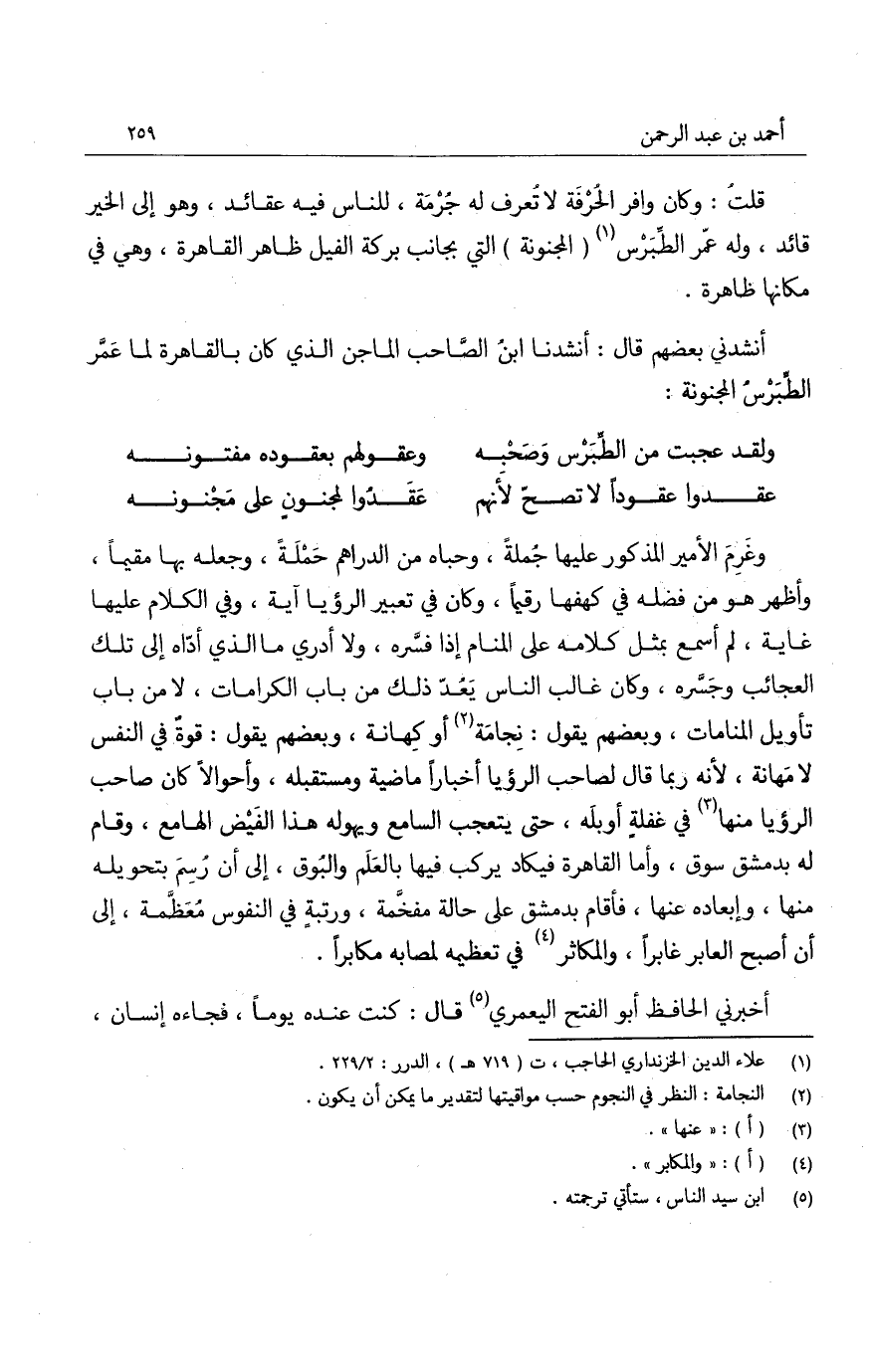 وعزم الأمير الذكور عليها جُملةً، وحباه من الدراهم حملةً، وجعله بها مقيماً، وأظهر هو من فضله في كهفها رقيماً، وكان في تعبير الرؤيا آية، وفي الكلام عليها غاية، لم أسمع بمثل كلامه على المنام إذا فسَّره، ولا أدري ما الذي أدّاه إلى تلك العجائب وجسِّره، وكان غالب الناس يعدّ ذلك من باب الكرامات، لا من باب تأويل المنامات، وبعضهم يقول: نجامة أو كهانة، وبعضهم يقول: قوةٌ في النفس لا مهانة، لأنه ربما قال لصاحب الرؤيا أخباراً ماضية ومستقبله، وأحوالاً كان صاحب الرؤيا منها في غفلة أوبله، حتى يتعجب السامع ويهوله هذا الفيض الهامع، وقام له بدمشق سوق، وأما القاهرة فيكاد يركب فيها بالعَلم والبُوق، إلى أن رُسم بتحويله منها وإبعاده عنها، فأقام بدمشق على حاله مفخَّمة، ورتبةٍ في النفوس مُعظمة، إلى أن أصبح العابر غابراً، والمكاثر في تعظيمه لمصابه مكابراً.