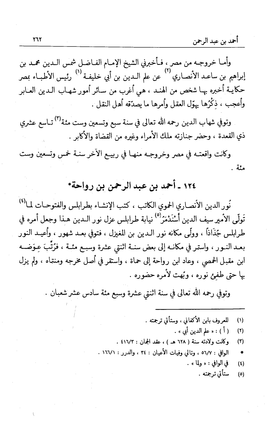 نُور الدين الأنصاري الحموي الكاتب، كتب الإنشاء بطرابلس والفتوحات لما تولّى الأمير سيف الدين أسنَدْمَرُ نيابة طرابلس عزل نور الدين هذا وجعل أمره في طرابلس جُذَاذاً، وولّى مكانه تور الدين بن المغيزل، فتوفي بعد شهور، وأعيد النور بعد النور، واستمر في مكانه إلى بعض سنة اثنتي عشرة وسبع مئة، فرُتِّبَ عِوَضه ابن مقبل الحمصي، وعاد ابن رواحة إلى حماة، واستقر في أصل مخرجه ومنتماه، ولم يزل بها حتى طفِئ نوره، وبُهت لأمره حضوره.