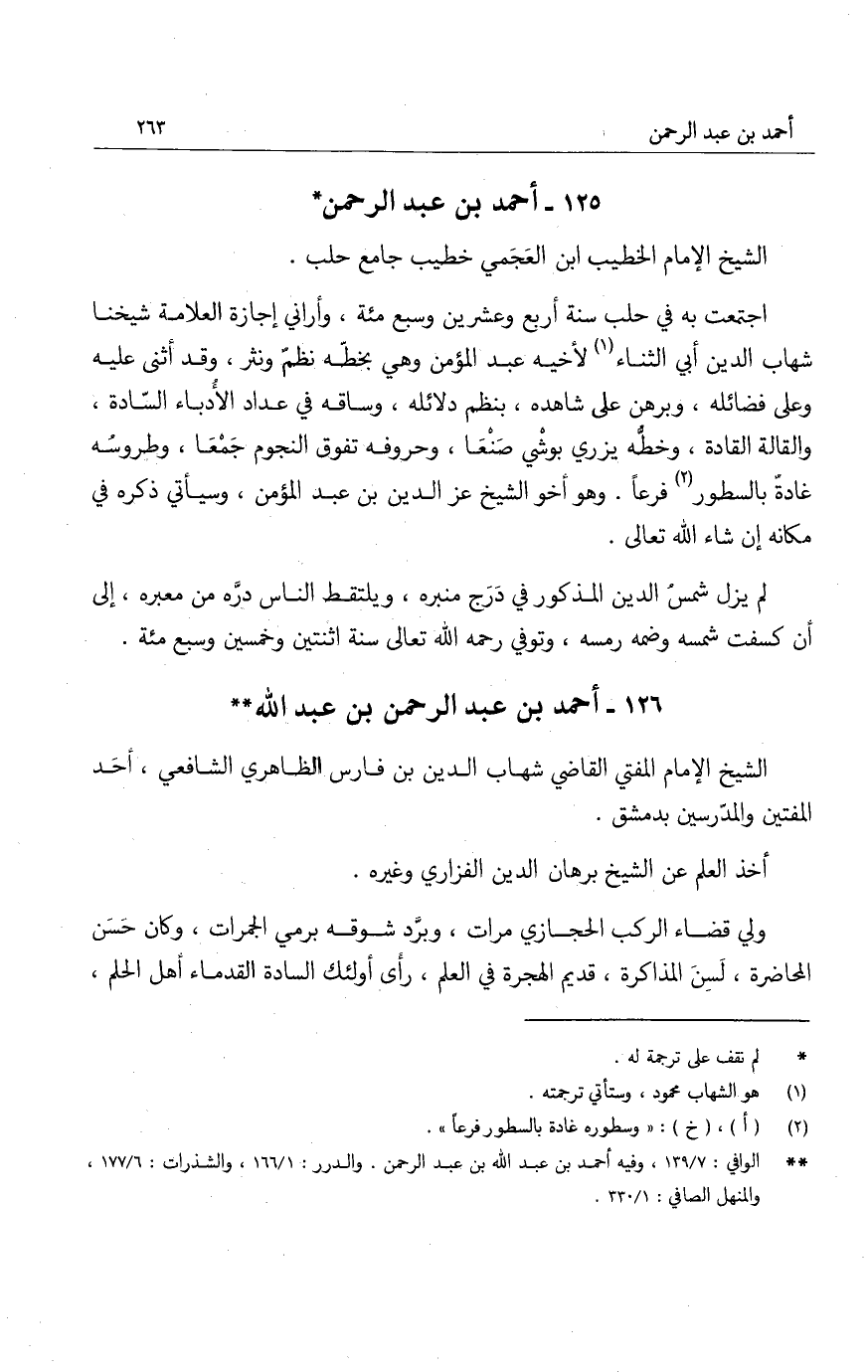 اجتمعت به في حلب سنة أربع وعشرين وسبع مئة، وأراني إجازة العلامة شيخنا شهاب الدين أبي الثناء لأخيه عبد المؤمن وهي بخطّه نظمّ ونثر، وقد أثنى عليه وعلى فضائله، وبرهن على شاهده، بنظم دلائله، وساقه في عداد الأدباء السّادة، والقالة القادة، وخطُّه يزري بوشي صَنْعَا، وحروفه تفوق النجوم جَمعَا، وطروسُه غادةٌ بالسطور فرعاً. وهو أخو الشيخ عز الدين بن عبد المؤمن، وسيأتي ذكره في مكانه إن شاء الله تعالى.