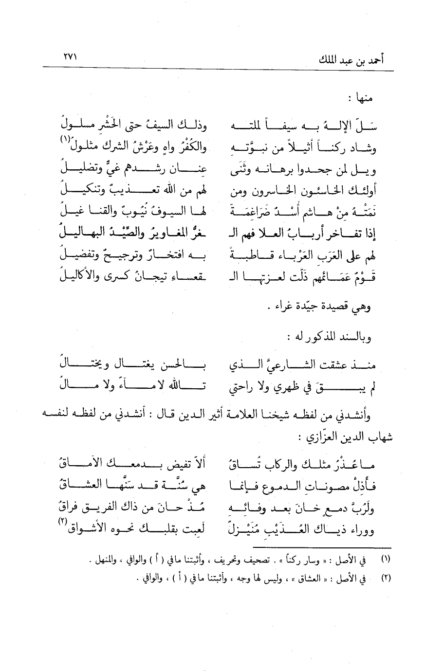 وأنشدني من لفظه شيخنا العلامة أثير الدين قال: أنشدني من لفظه لنفسه شهاب الدين العزّازي: