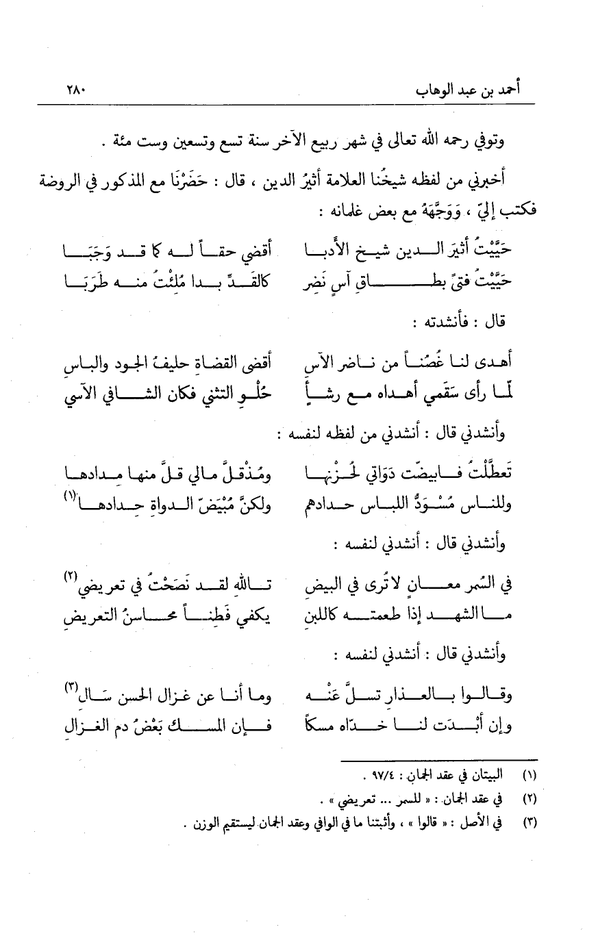 أخبرني من لفظه شيخُنا العلامة أثيرُ الدين، قال: حَضَرنَا مع المذكور في الروضة فكتب إليّ، وَوَجَّهَهُ مع بعض غلمانه: