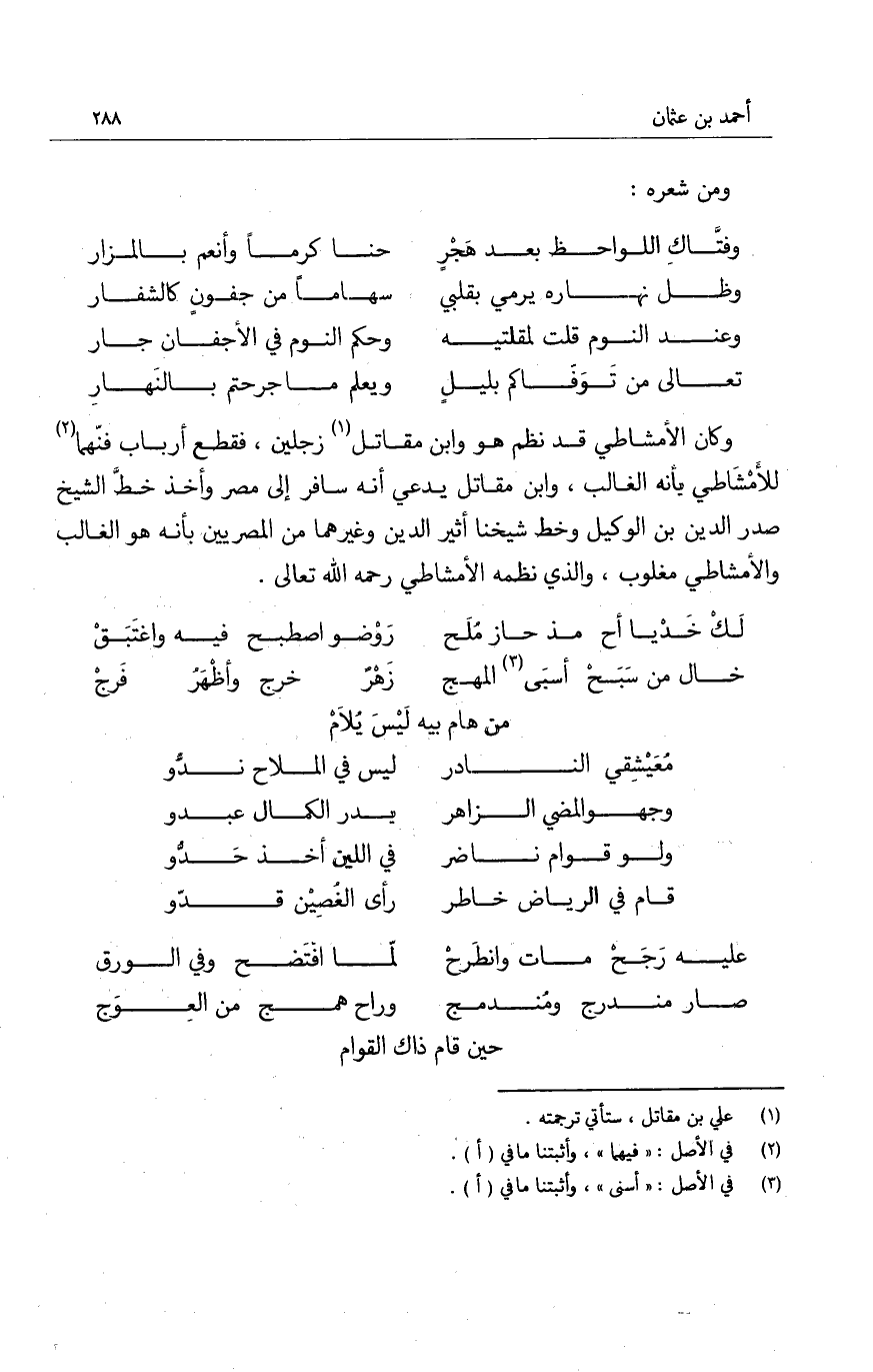 وكان الأمشاكي قد نظم هو وابن مقاتل زجلين، فقطع أرباب فنّهما للأمشاطي بأنه الغالب، وابن مقاتل يدعي أنه سافر إلى مصر وأخذ خطَّ الشيخ صدر الدين بن الوكيل وخط شخنا أثير الدين وغيرهما من المصريين بأنه هو الغالب والأمشاطي رحمه الله تعالى.