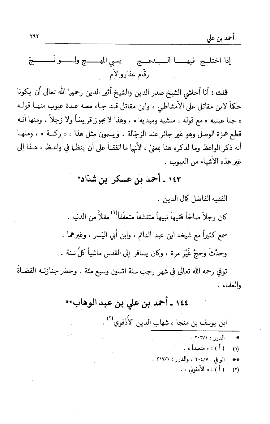 قلت: أنا أحاشي الشيخ صدر الدين والشيخ أثير الدين رحمهما الله تعالى أن يكونا حكماً لابن مقاتل على الأمشاطي، وابن مقاتل قد جاء معه عدة عيوب منها قوله " جنا عينيه " مع قوله " منشية ومبدية "، وهذا لا يجوز قريضاً ولا زجلاً، ومنها قطع همزة الوصل وهو غير جائز عند الزجّالة، ويسمون مثل هذا: " ركبة "، ومنها أنه ذكر الواعظ وما لذكره هنا بمعنى، لأنهما ما تفقا على أن ينظما في واعظ، هذا إلى غير هذه الأشياء من العيوب.